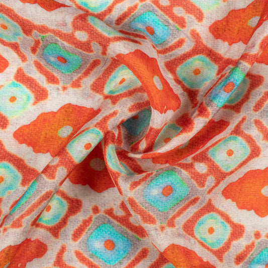 Burnt Orange And Sky Blue Trellis Pattern Digital Print Viscose Muslin Fabric Burnt Orange And Sky Blue Trellis Pattern Digital Print Viscose Muslin Fabric