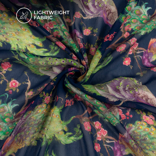 Navy Blue Peacock Digital Print Pure Georgette Fabric Navy Blue Peacock Digital Print Pure Georgette Fabric
