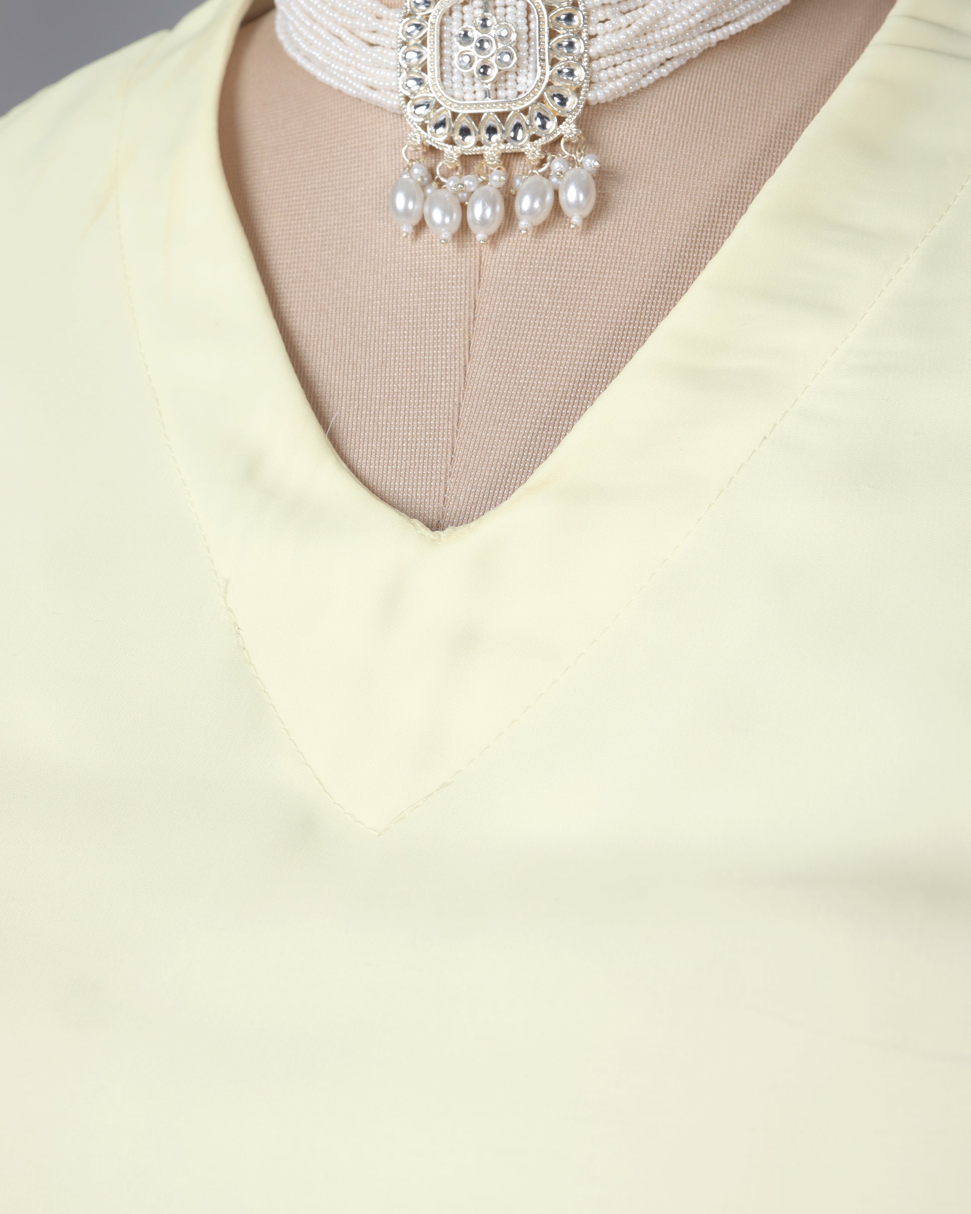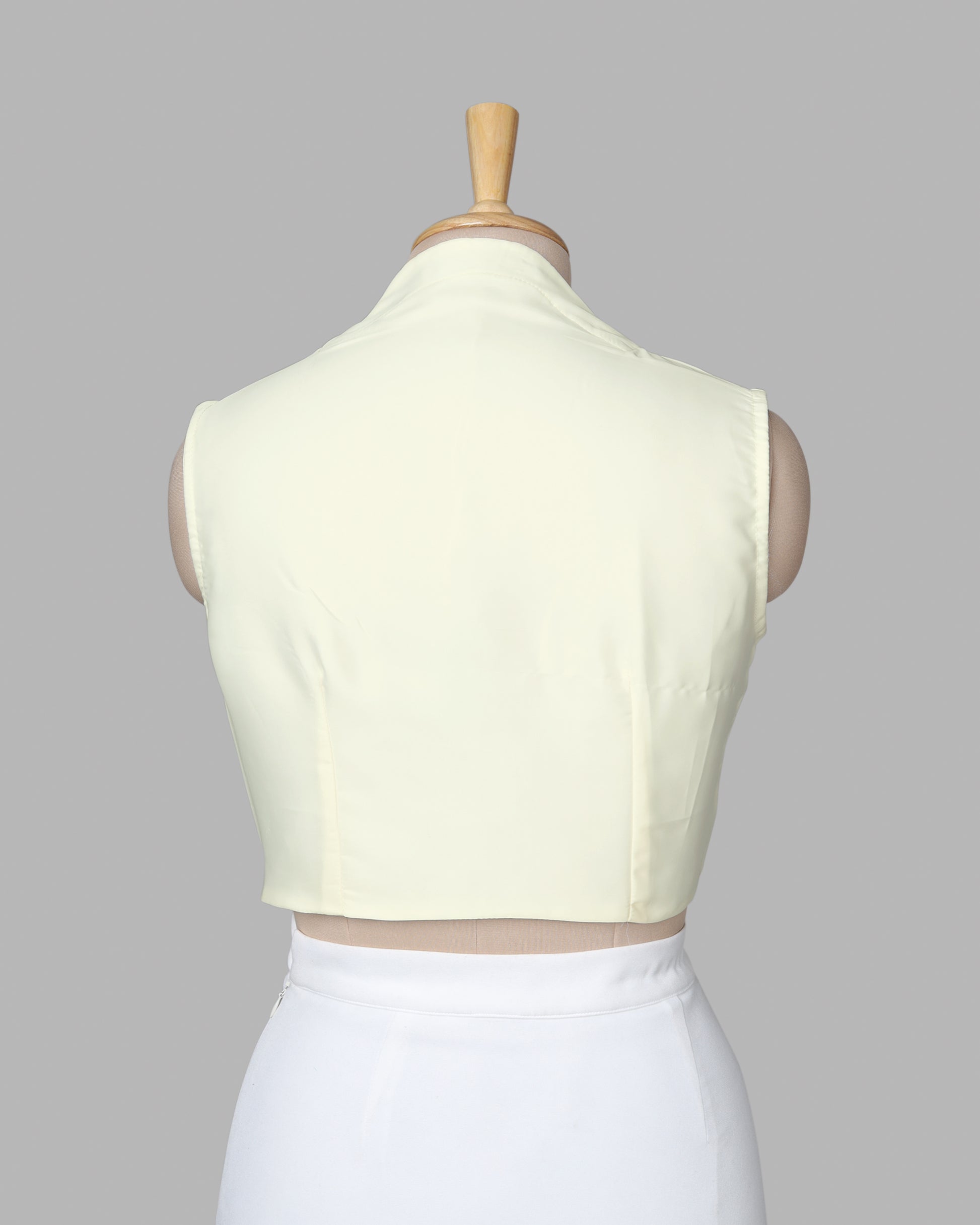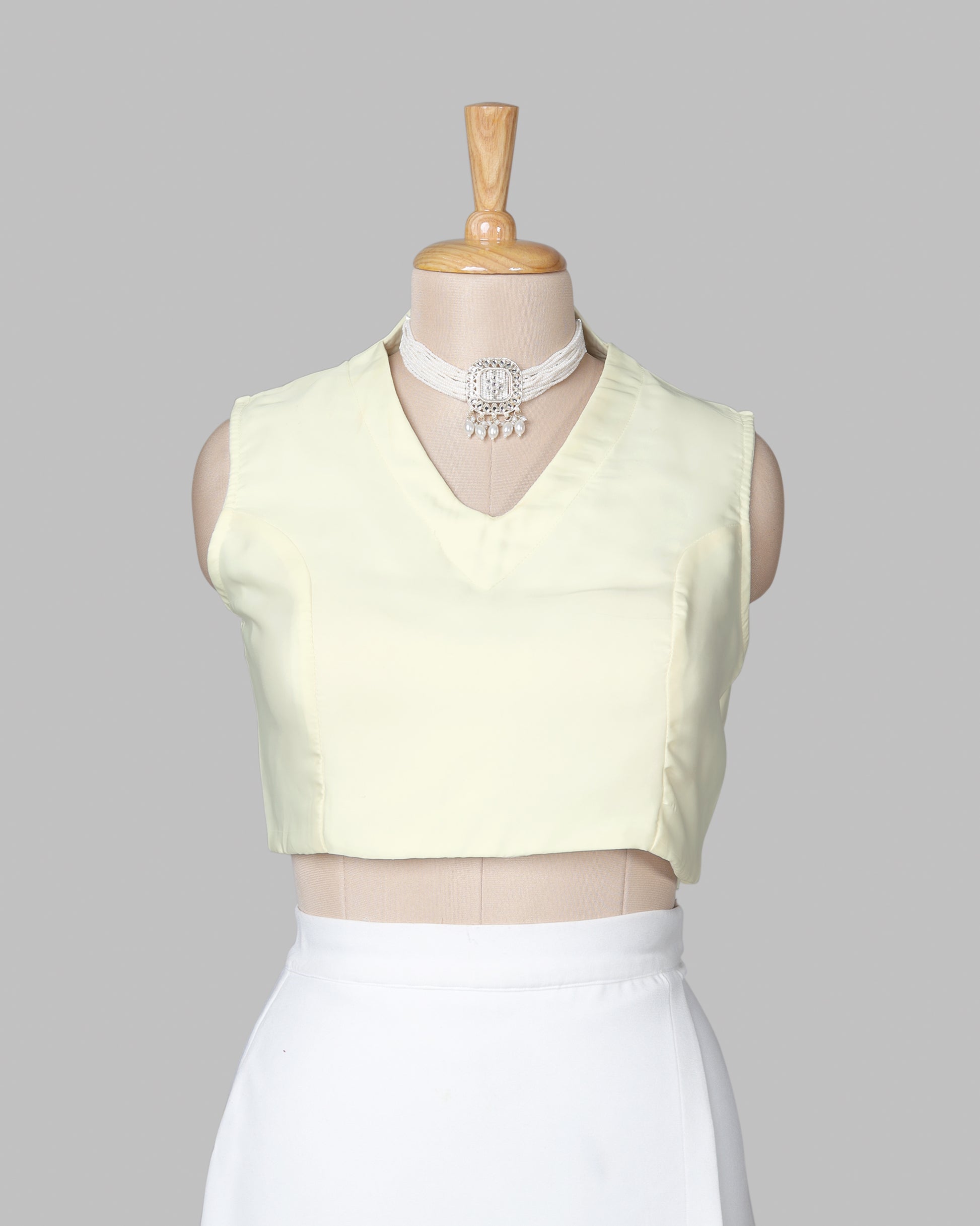 This off-white sleeveless blouse features a sleek V-neck design crafted from imported satin, offering a smooth and luxurious feel. Its plain, minimalist style makes it a versatile piece, perfect for layering or wearing alone for a polished, elegant look. Ideal for both formal and casual occasions, this blouse combines comfort with refined sophistication.