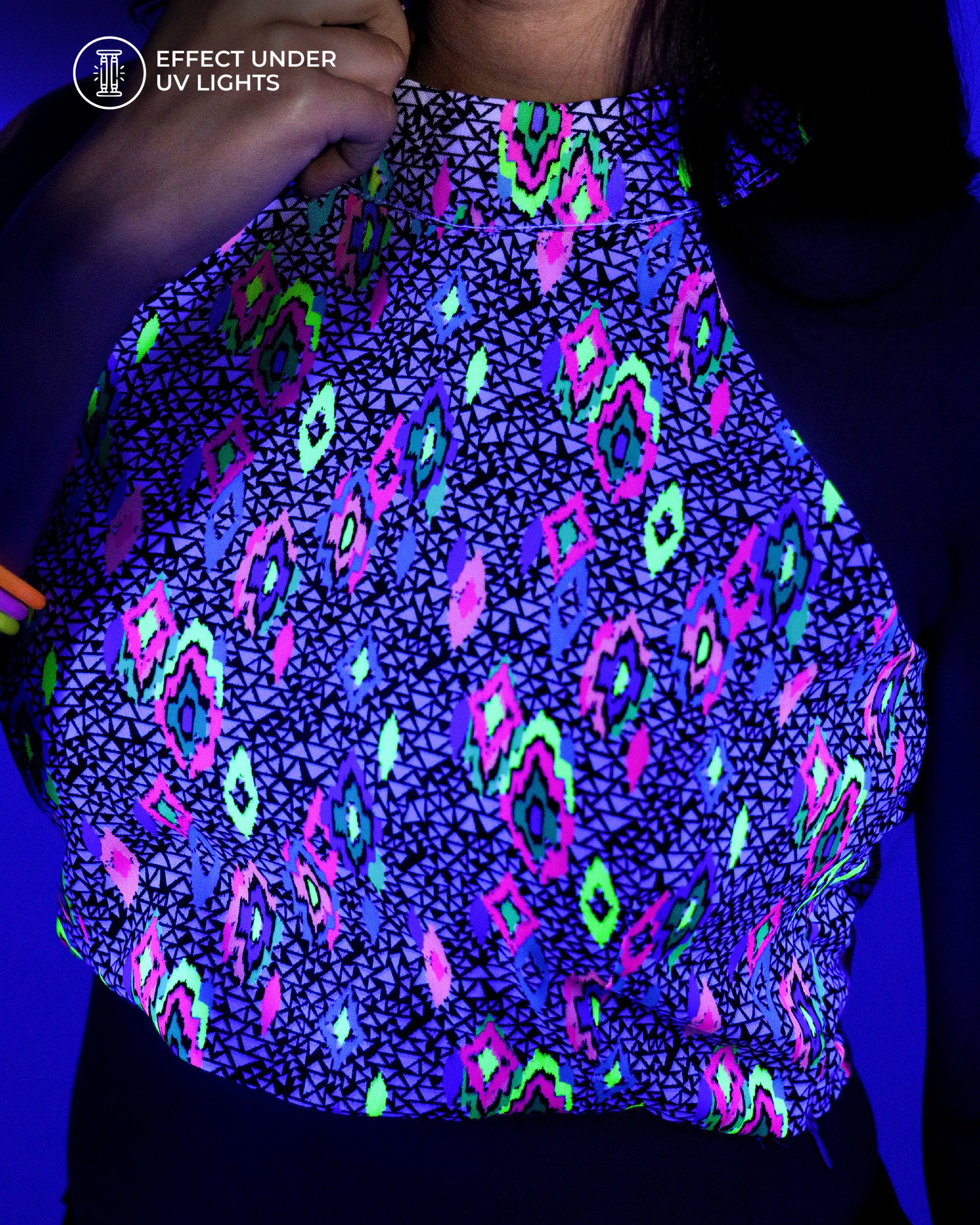 This playful blouse will add a pop of color to your wardrobe with its neon hue. In UV light, it shines even brighter! Perfect to pair with sarees, this blouse will surely make you stand out.
