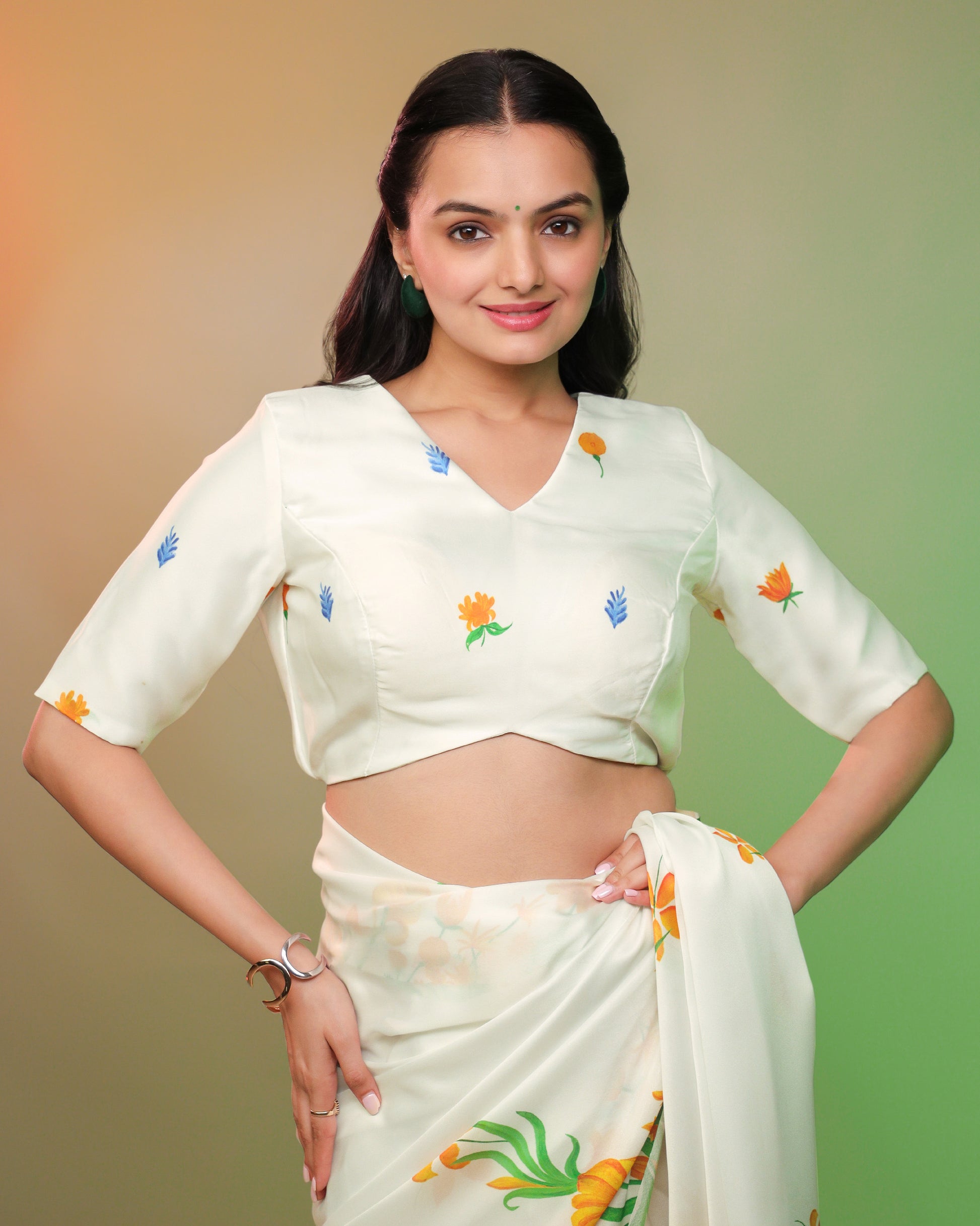The Undefended Blouse is not just an outfit — it’s a bold statement stitched in saffron, white, and green. Designed to honor the essence of Independence, unity, and strength, this tri-color blouse blends traditional emotion with modern edge.