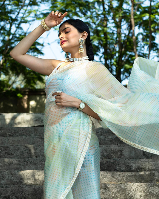 -20% offWhite And Blue Polka Dots Pattern Digtal Print Organza Satin Saree White And Blue Polka Dots Pattern Digtal Print Organza Satin Saree