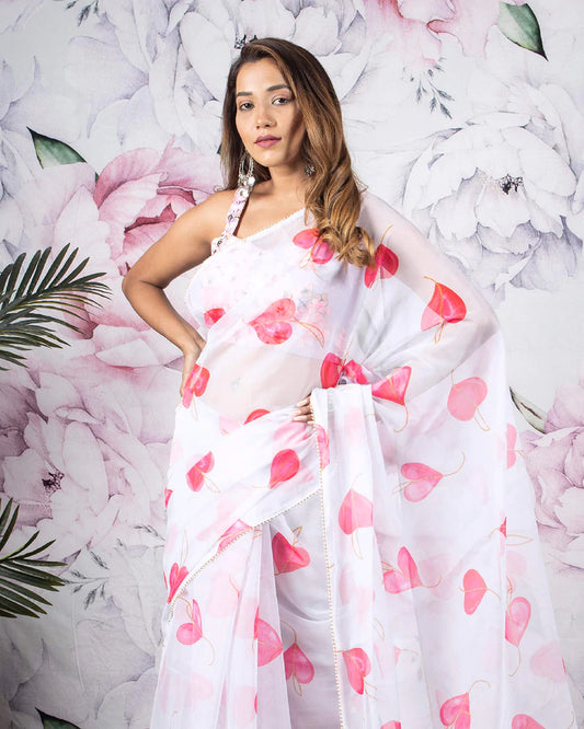-25% offWhite And Taffy Pink Floral Pattern Organza Satin Saree With Satin Border White And Taffy Pink Floral Pattern Organza Satin Saree With Satin Border