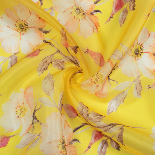 Bumblebee Yellow And Light Orange Floral Pattern Digital Print Organza Satin Fabric Bumblebee Yellow And Light Orange Floral Pattern Digital Print Organza Satin Fabric