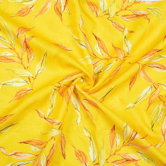 Bright Yellow And Salmon Orange Leaf Pattern Digital Print Ultra Premium Butter Crepe Fabric Bright Yellow And Salmon Orange Leaf Pattern Digital Print Ultra Premium Butter Crepe Fabric