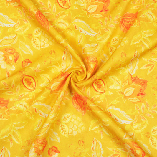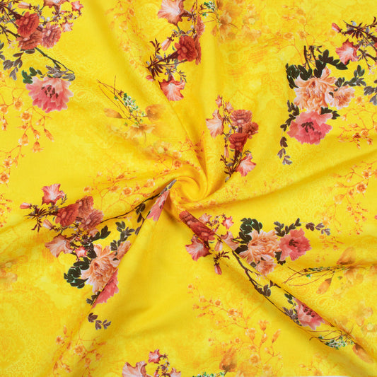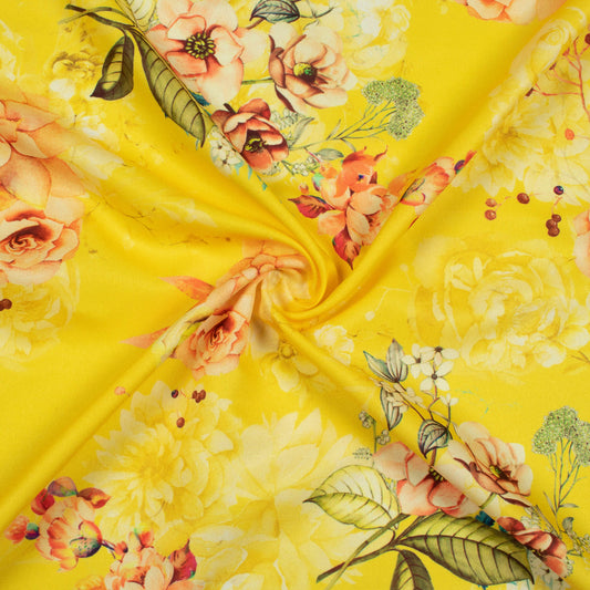 Bright Yellow And Peach Floral Pattern Digital Print Ultra Premium Butter Crepe Fabric Bright Yellow And Peach Floral Pattern Digital Print Ultra Premium Butter Crepe Fabric