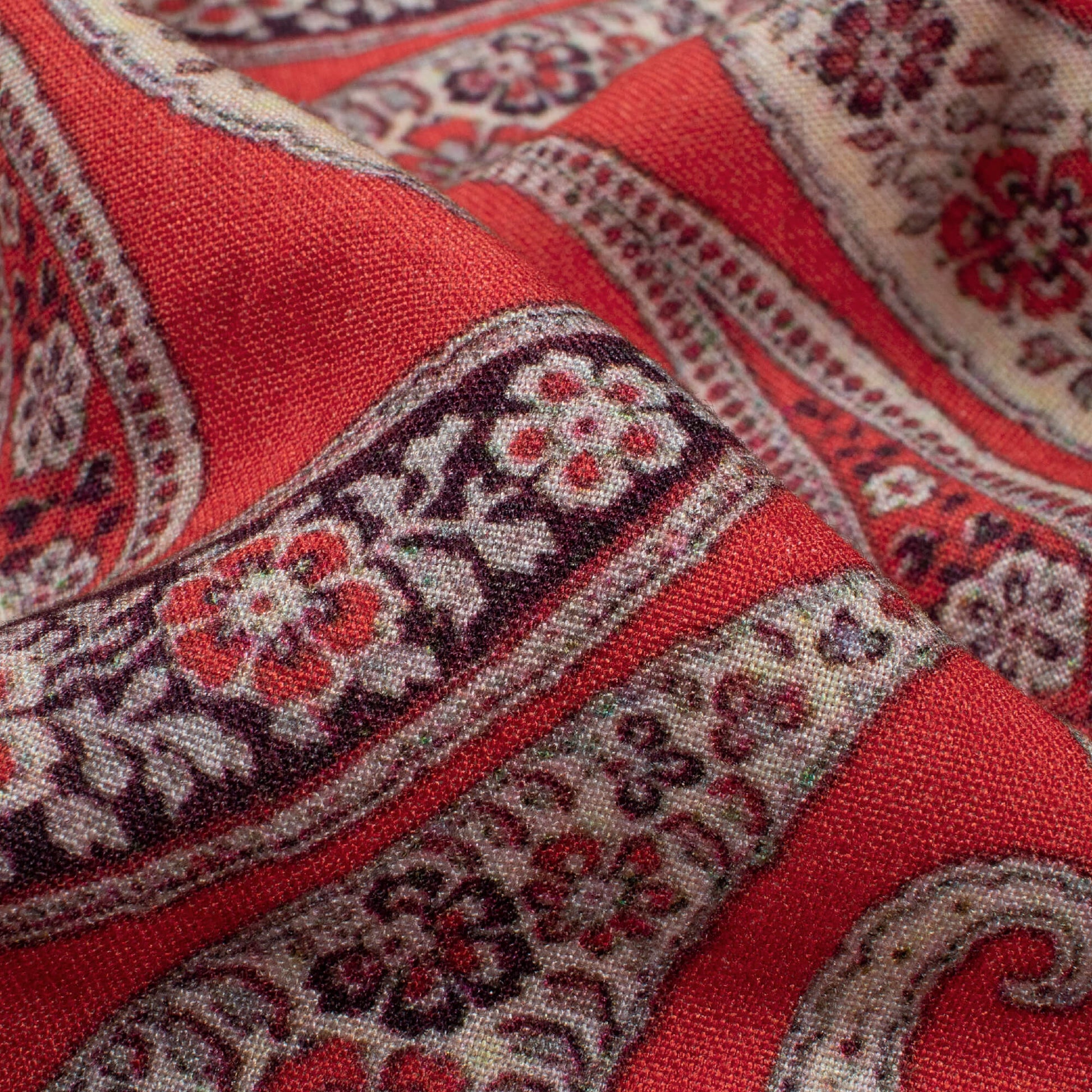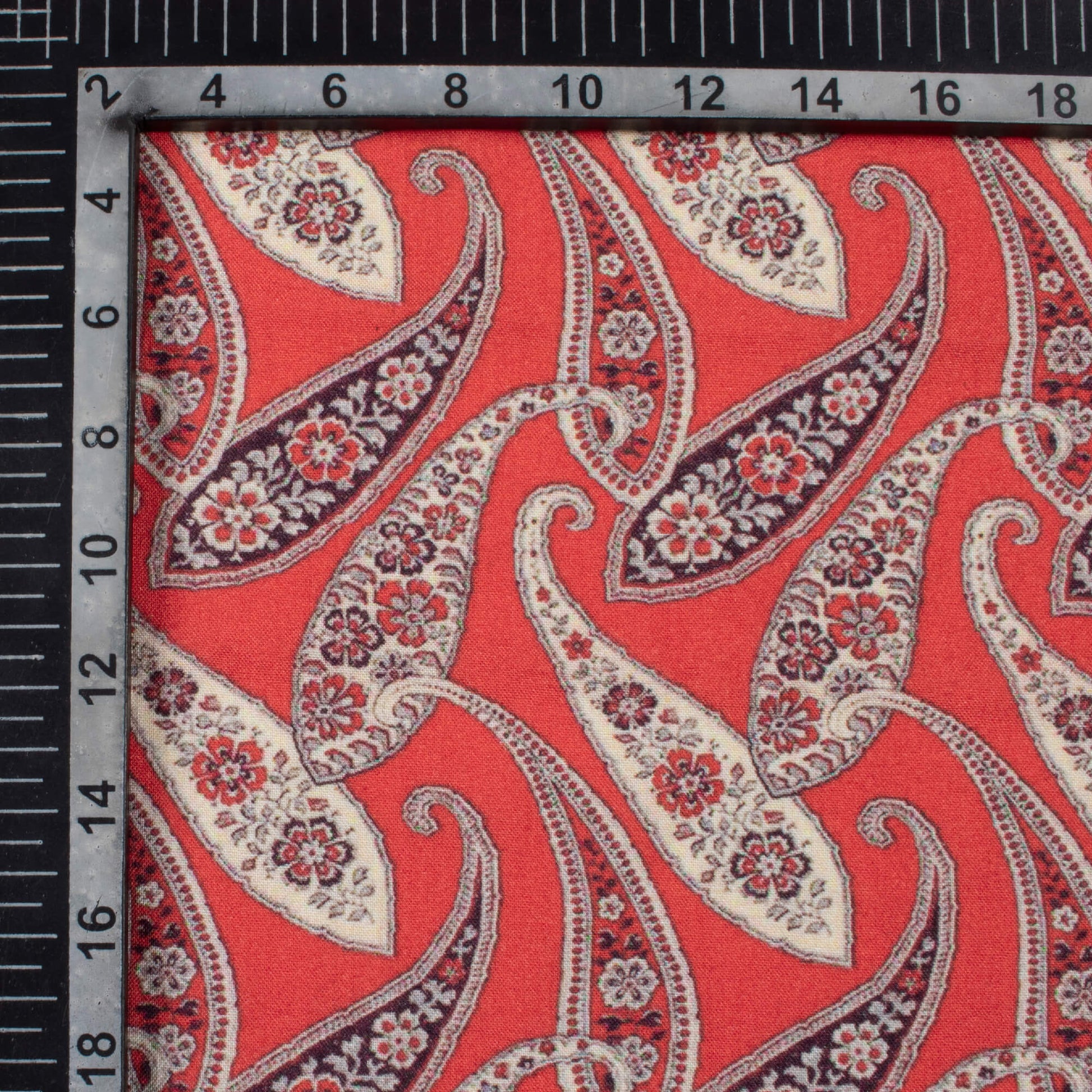 Vermilion Red And Beige Paisley Pattern Digital Print Viscose Rayon Fabric (Width 58 Inches)