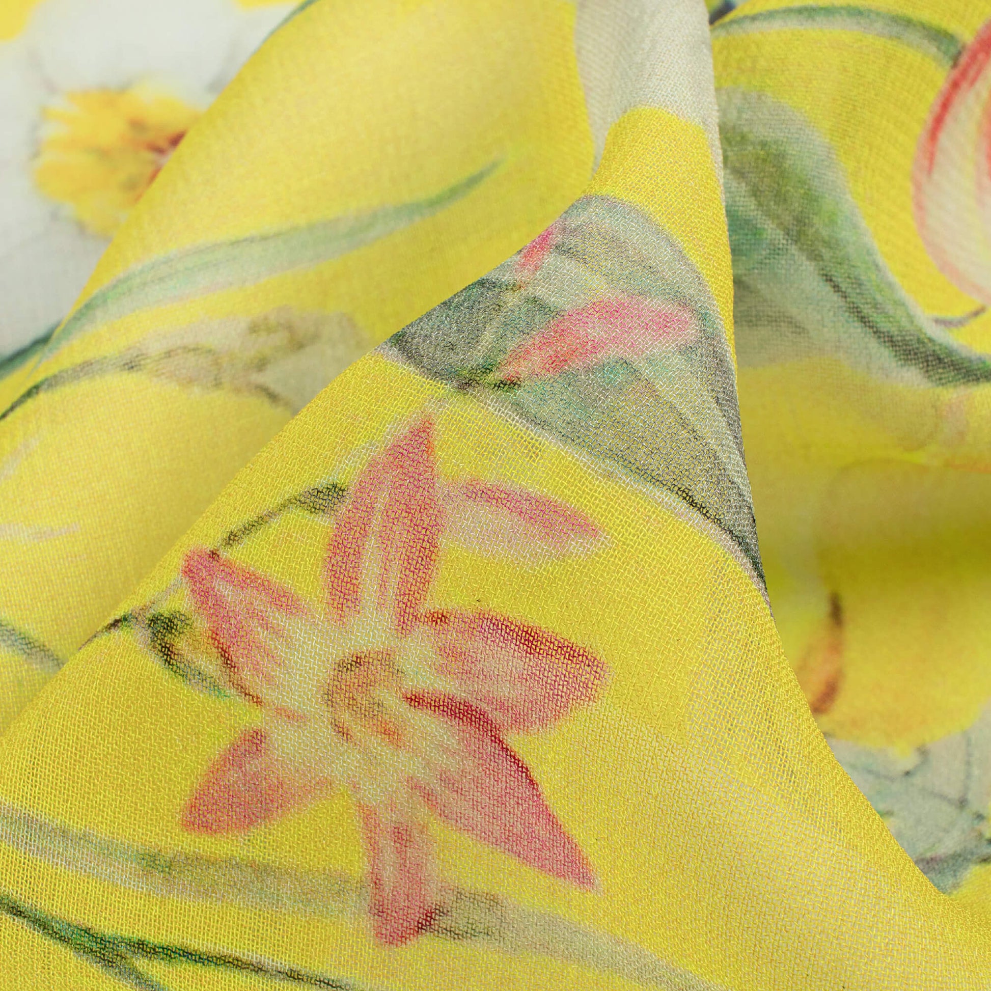 Canary Yellow And Pink Floral Pattern Digital Print Pure Georgette Fabric