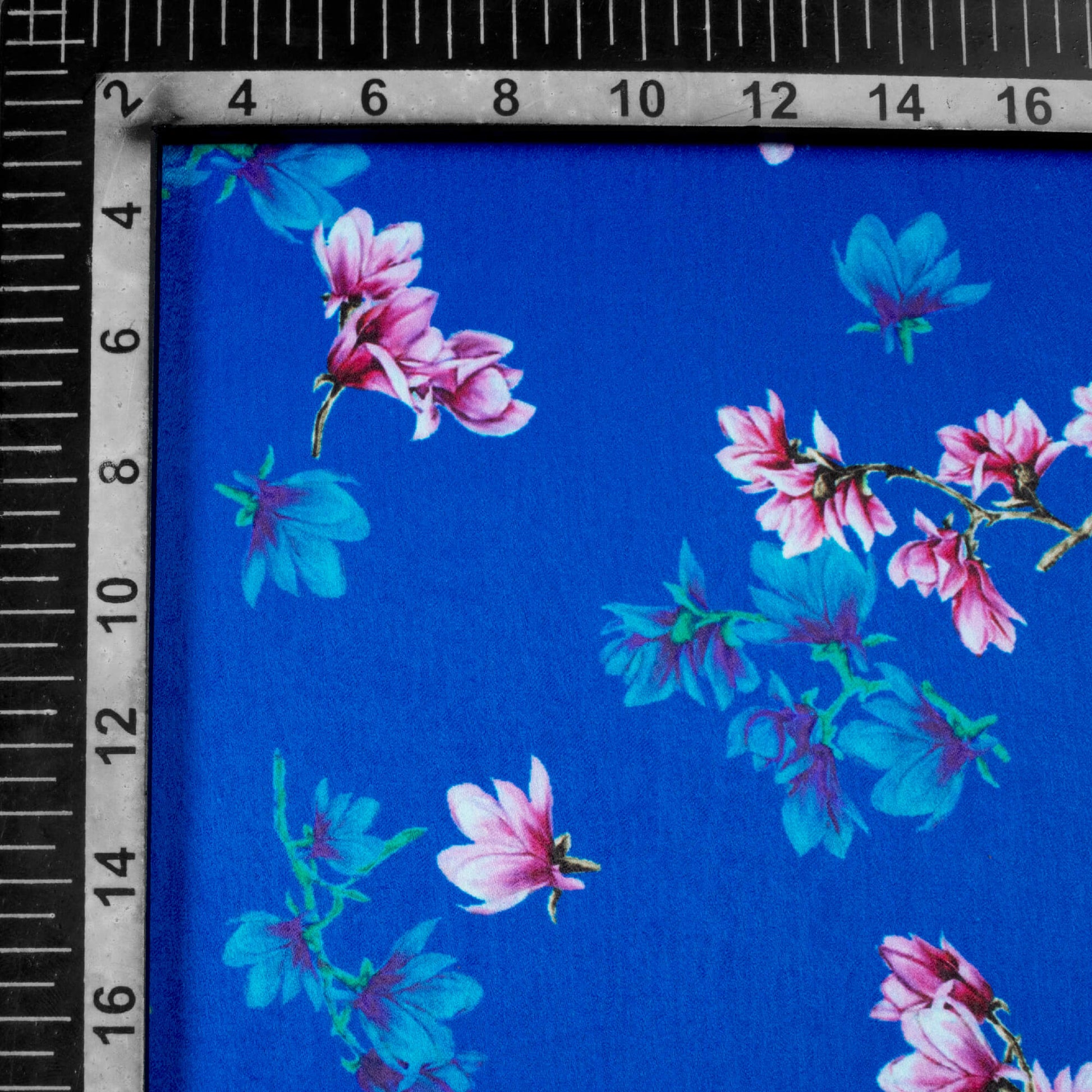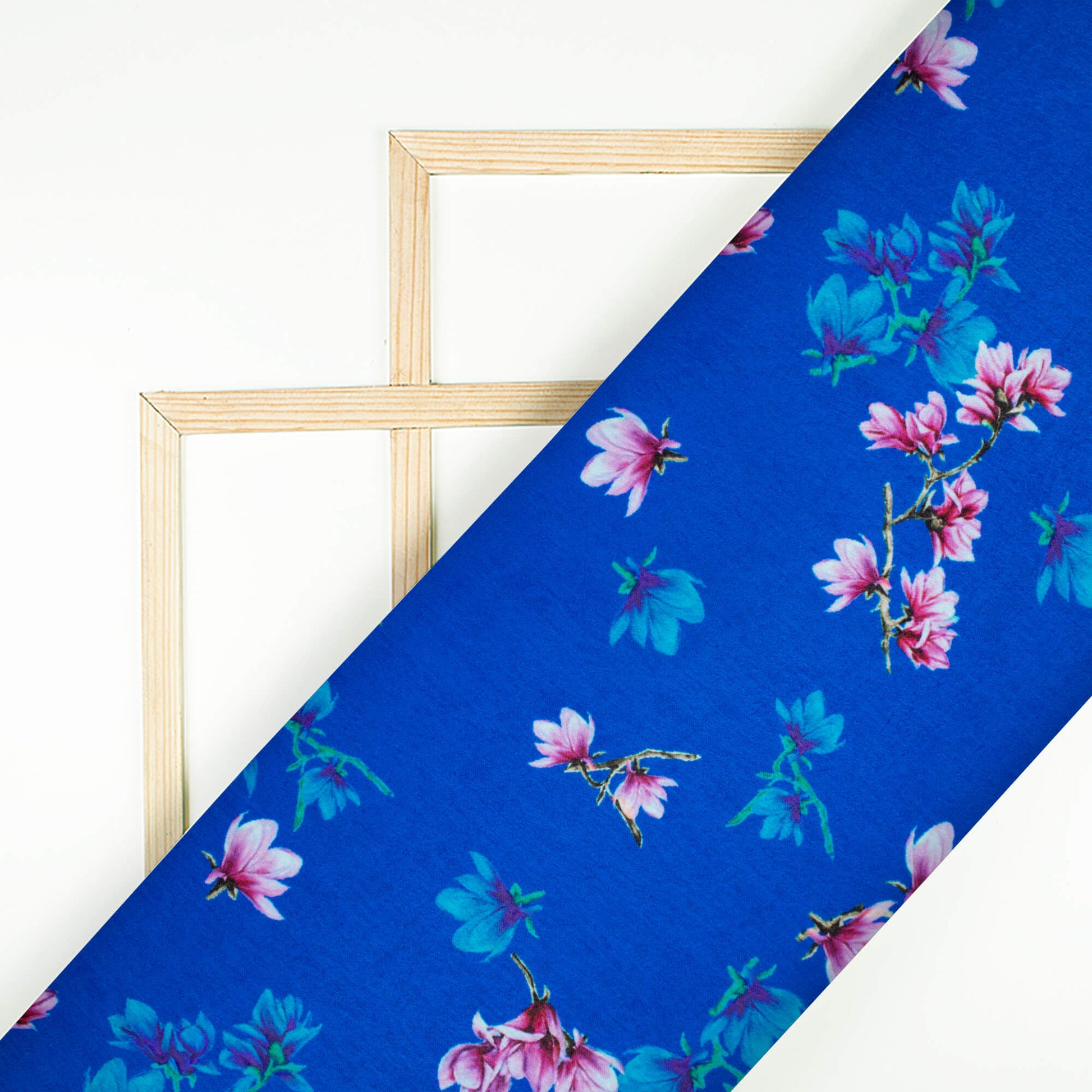 Cobalt Blue And Pink Floral Pattern Digital Print Lush Satin Fabric