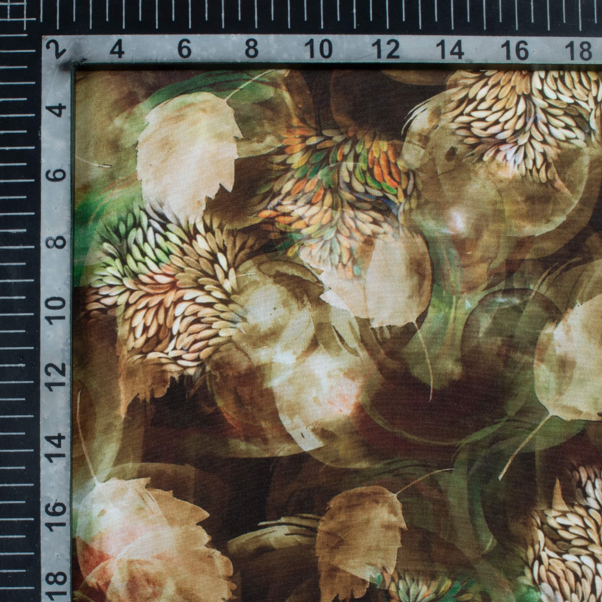 Coffee Brown And Basil Green Leaf Pattern Digital Print Crepe Silk Fabric