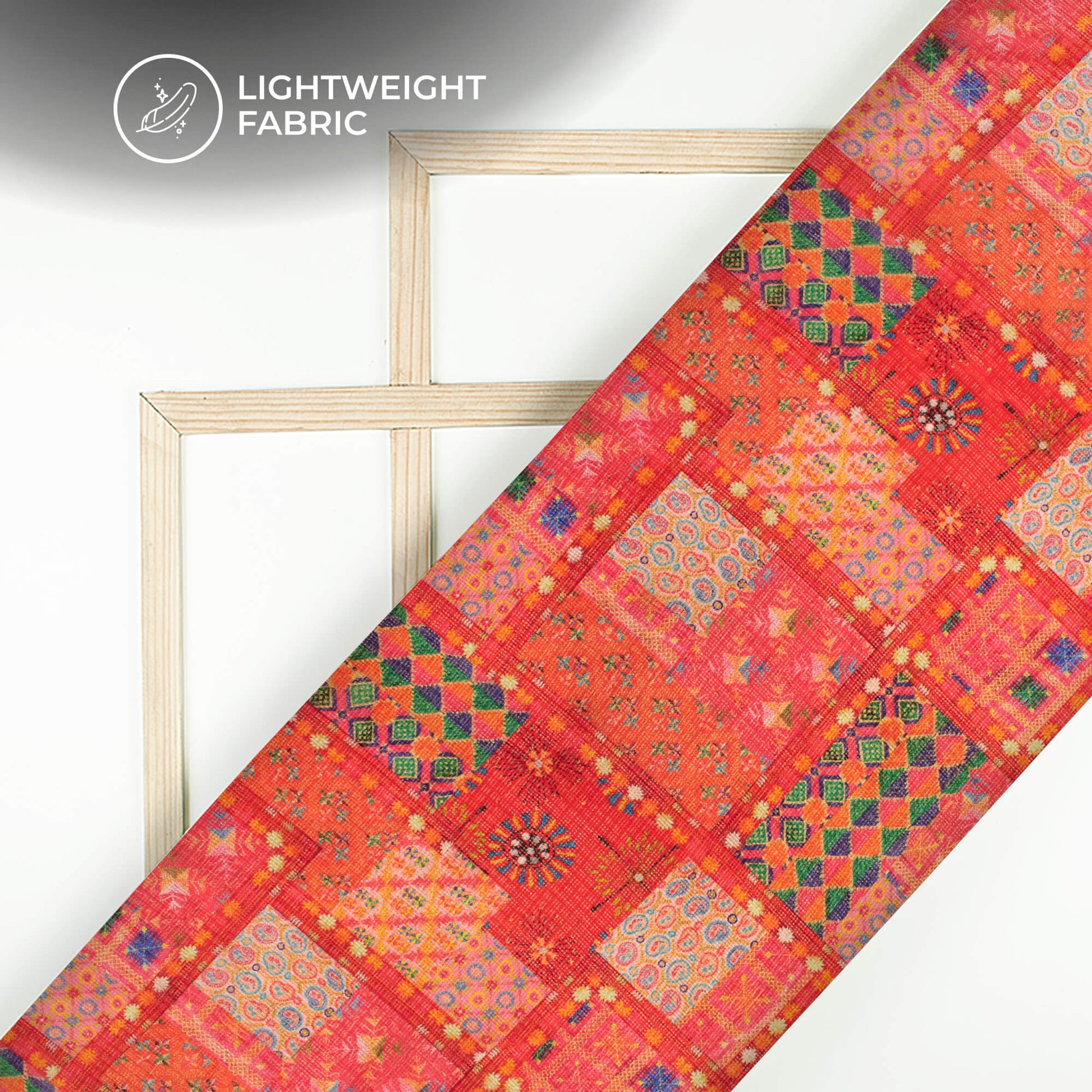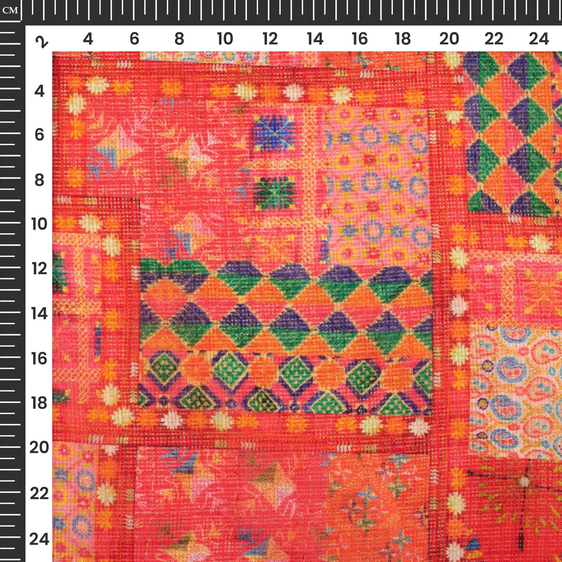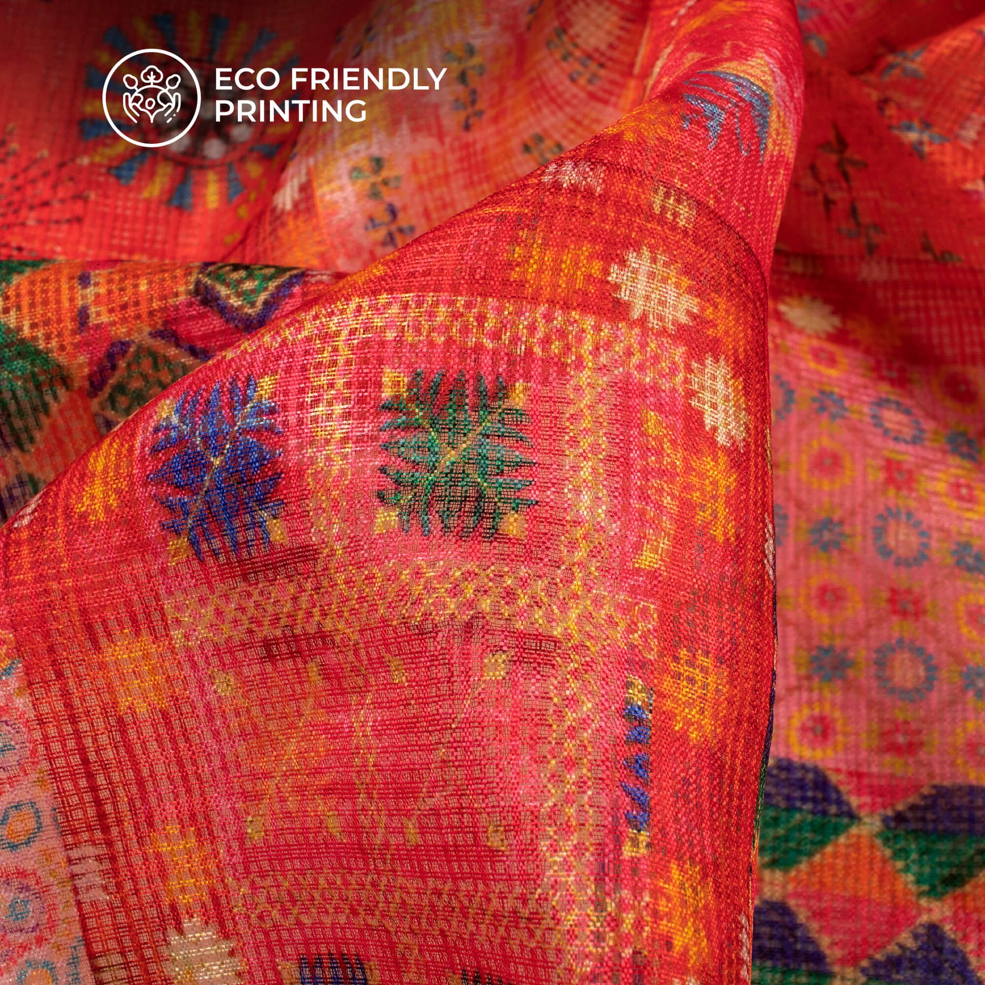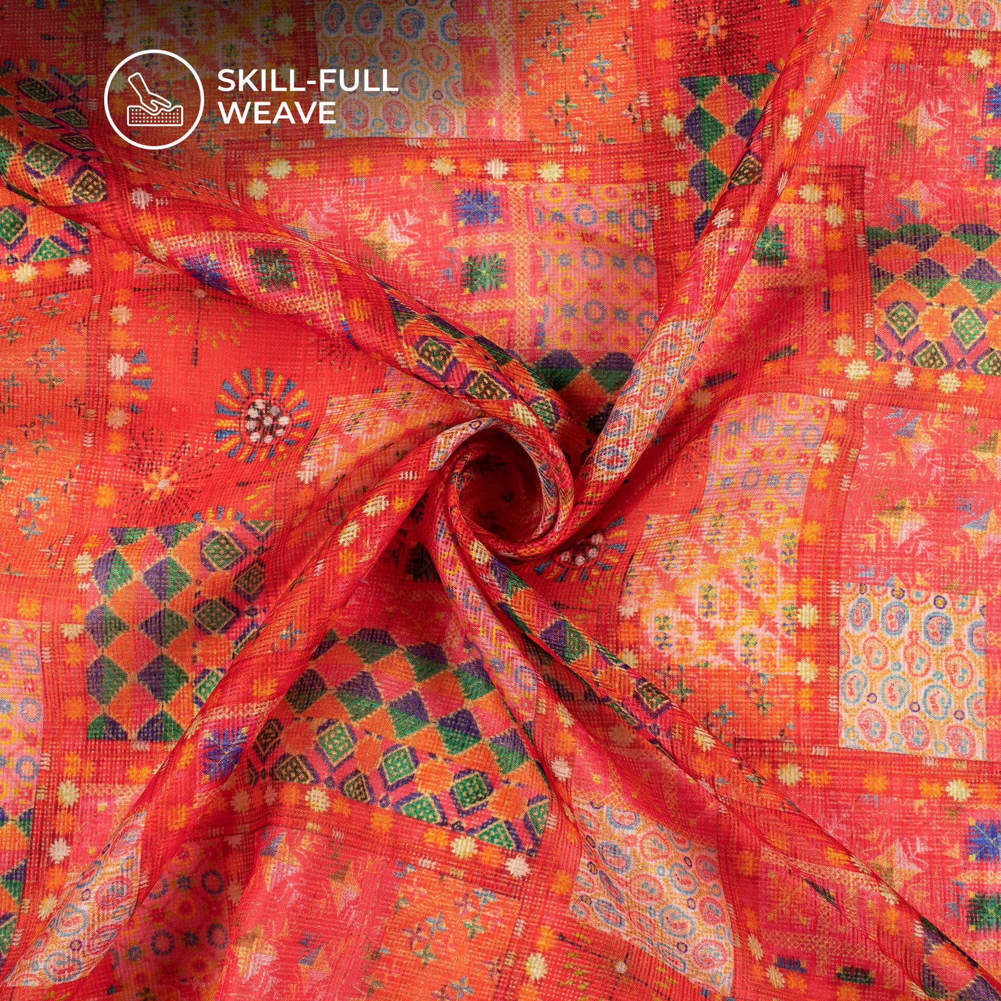 Exclusive Fire Orange And Green Geometric Digital Print Kota Doria Fabric