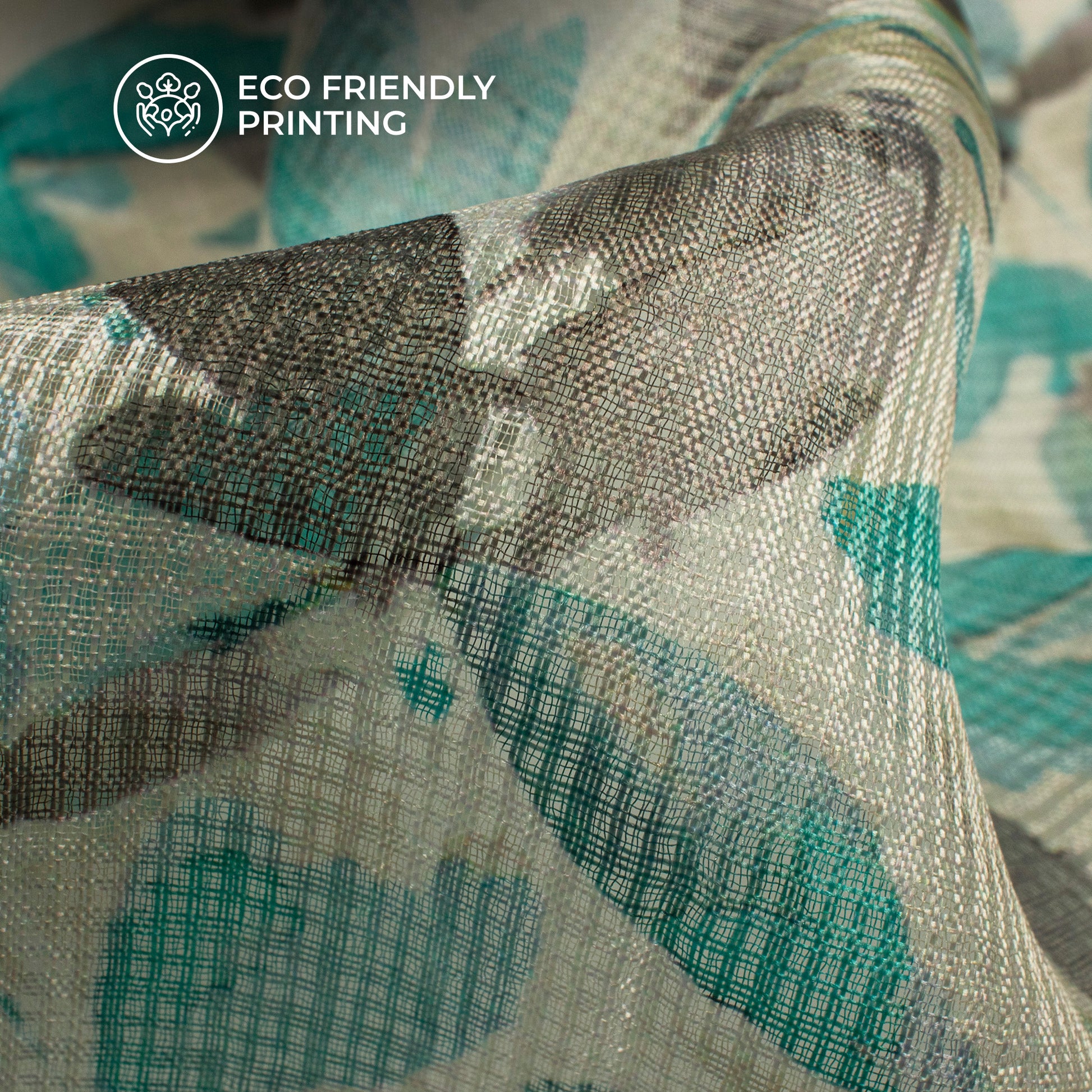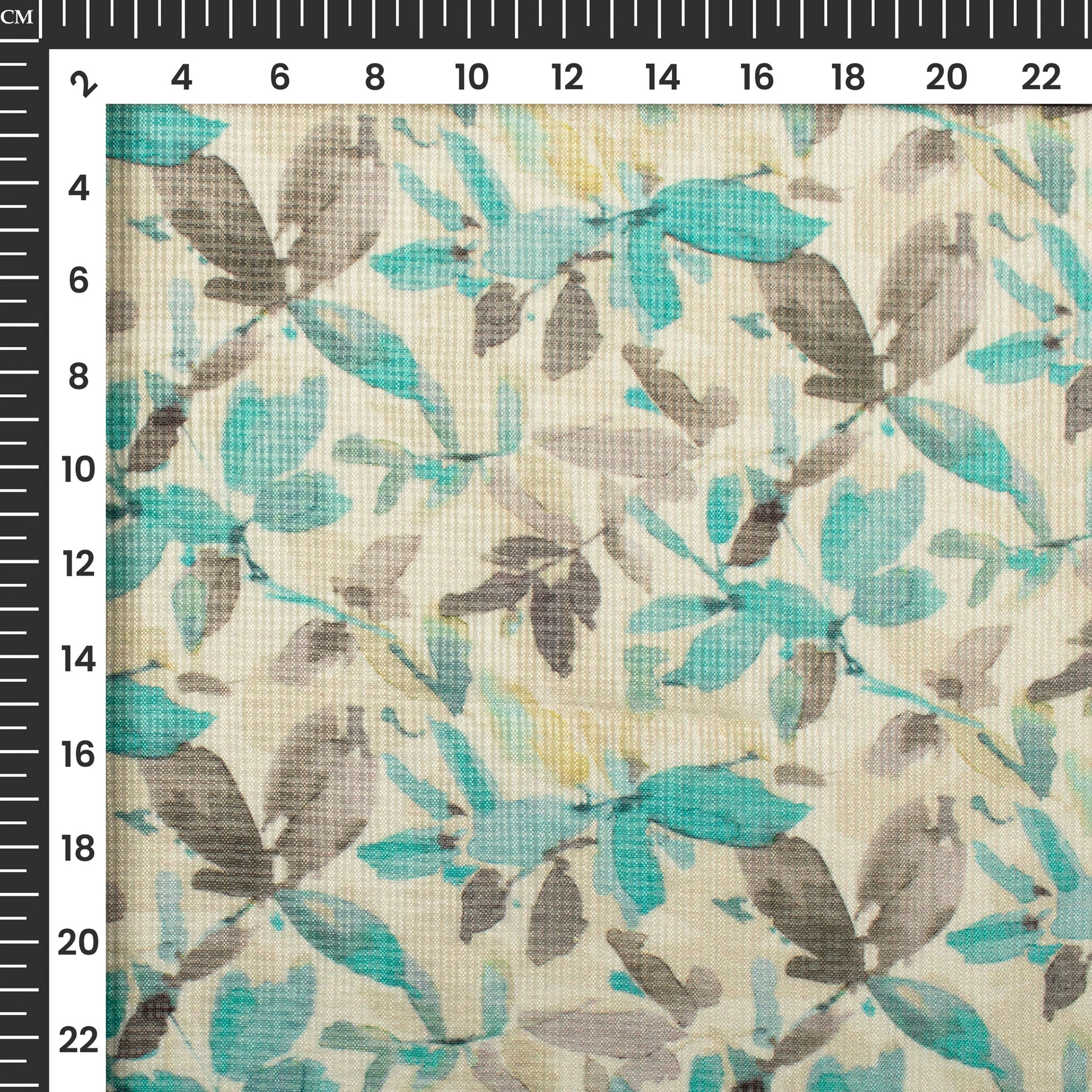 Ivory White And Teal Blue Leaf Digital Print Kota Doria Fabric