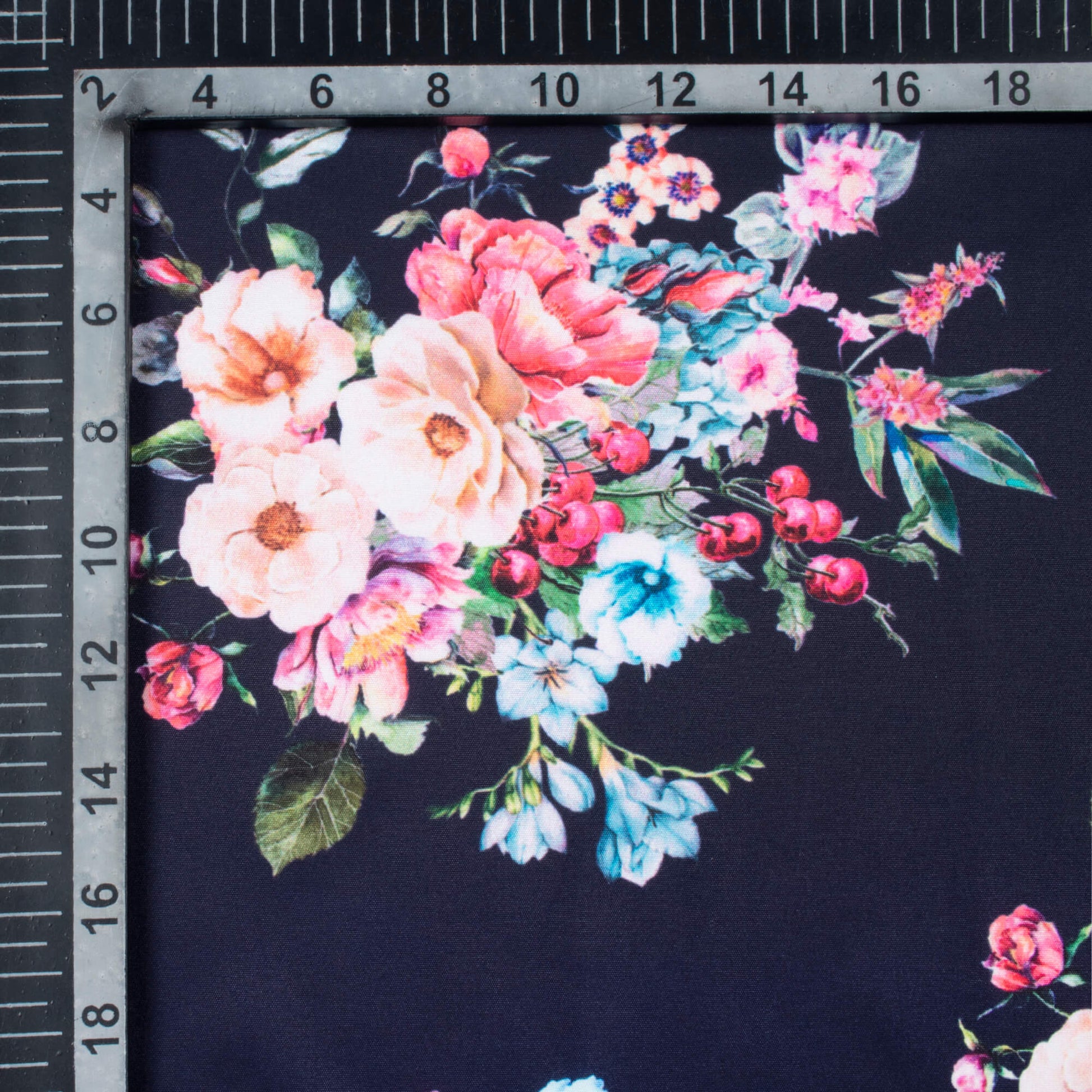 Midnight Blue And Rose Pink Floral Pattern Digital Print Poly Micro Crepe Fabric