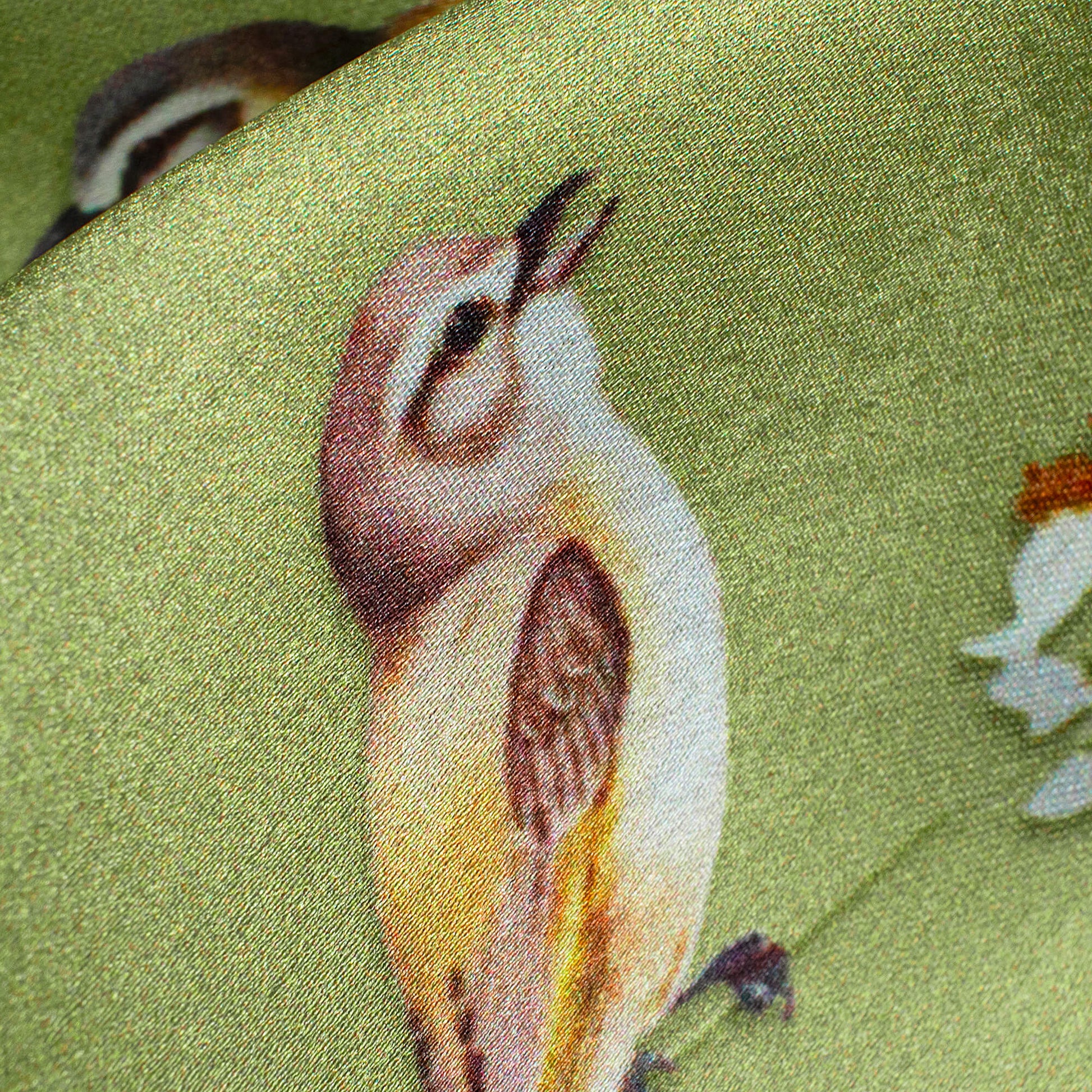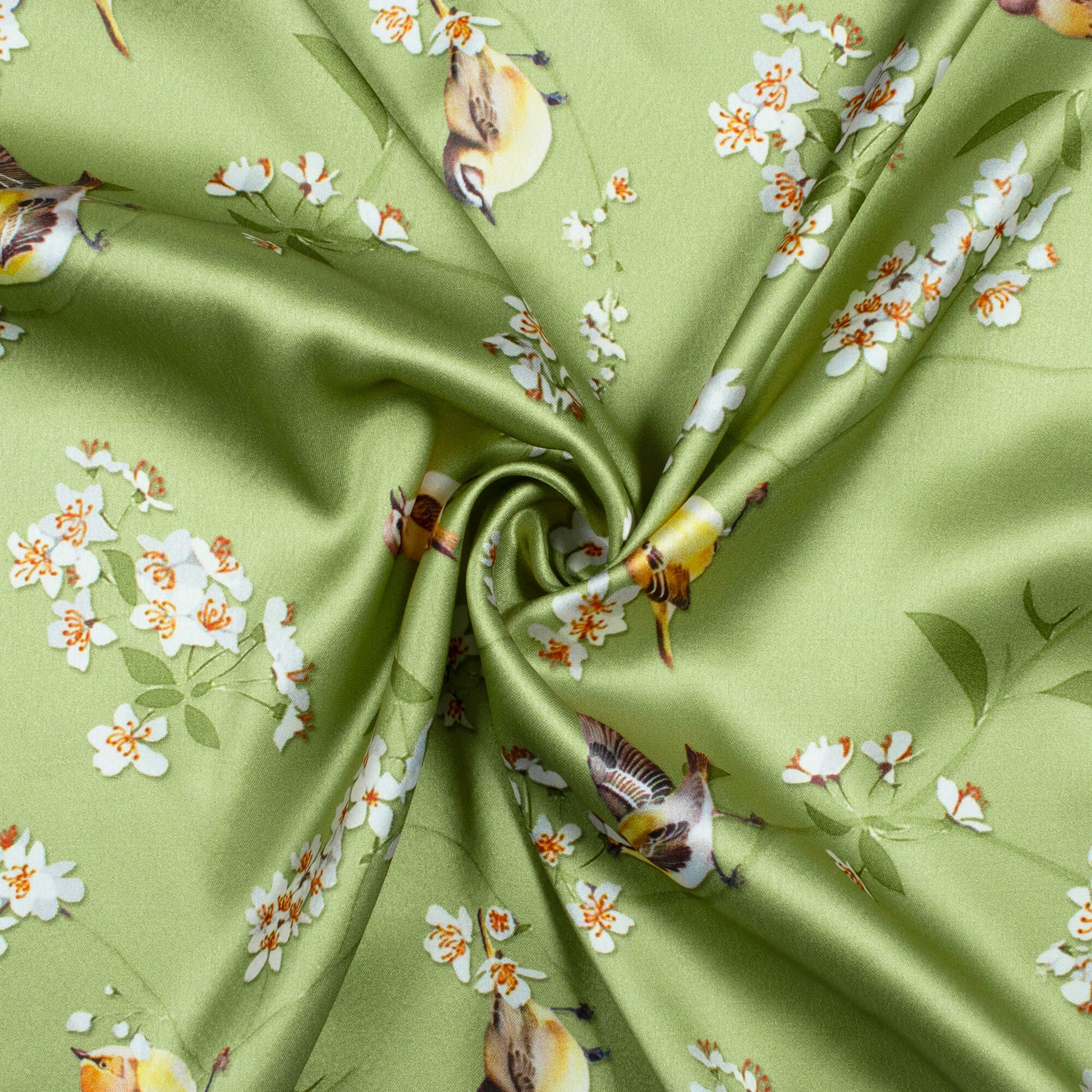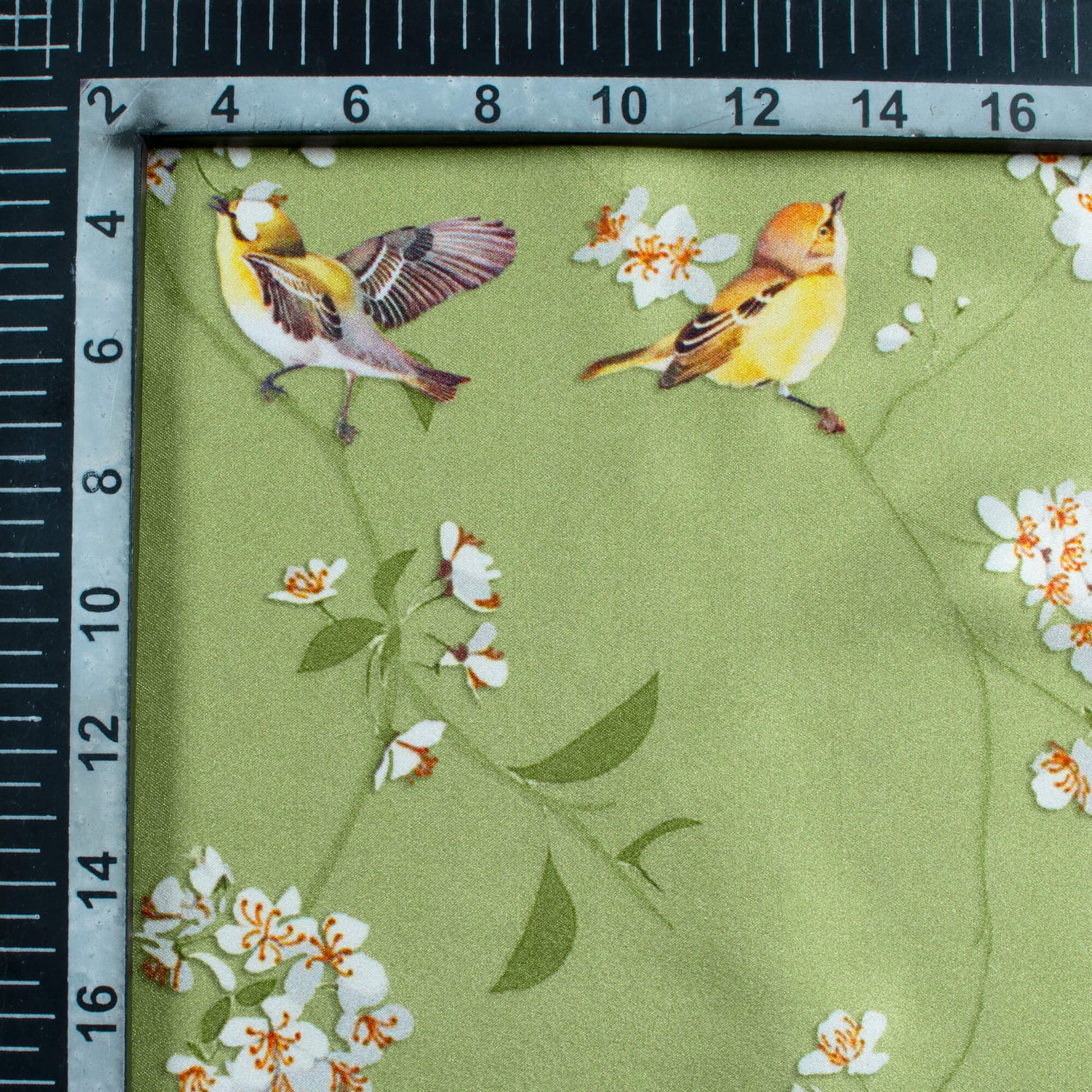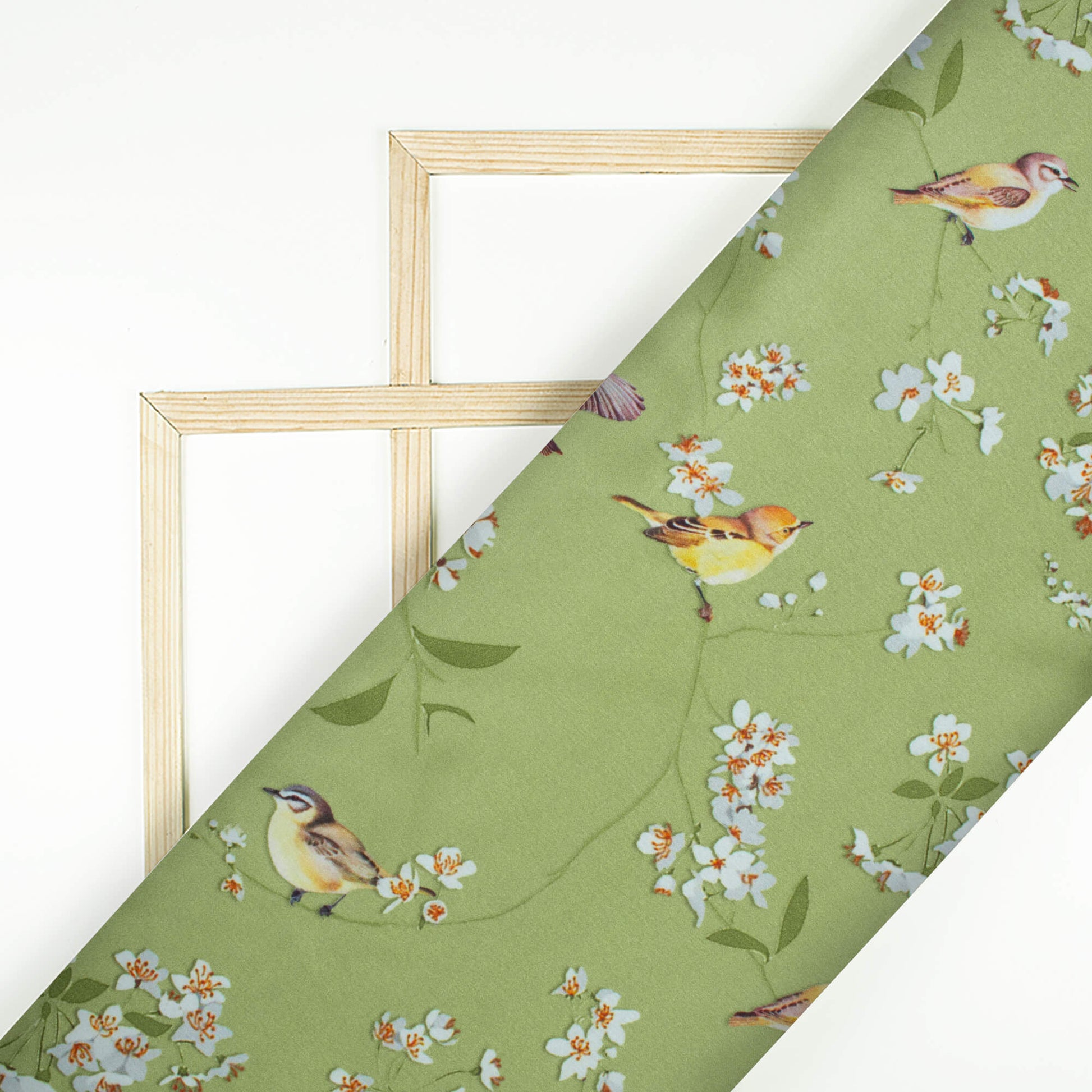 Moss Green And White Bird Pattern Digital Print Japan Satin Fabric