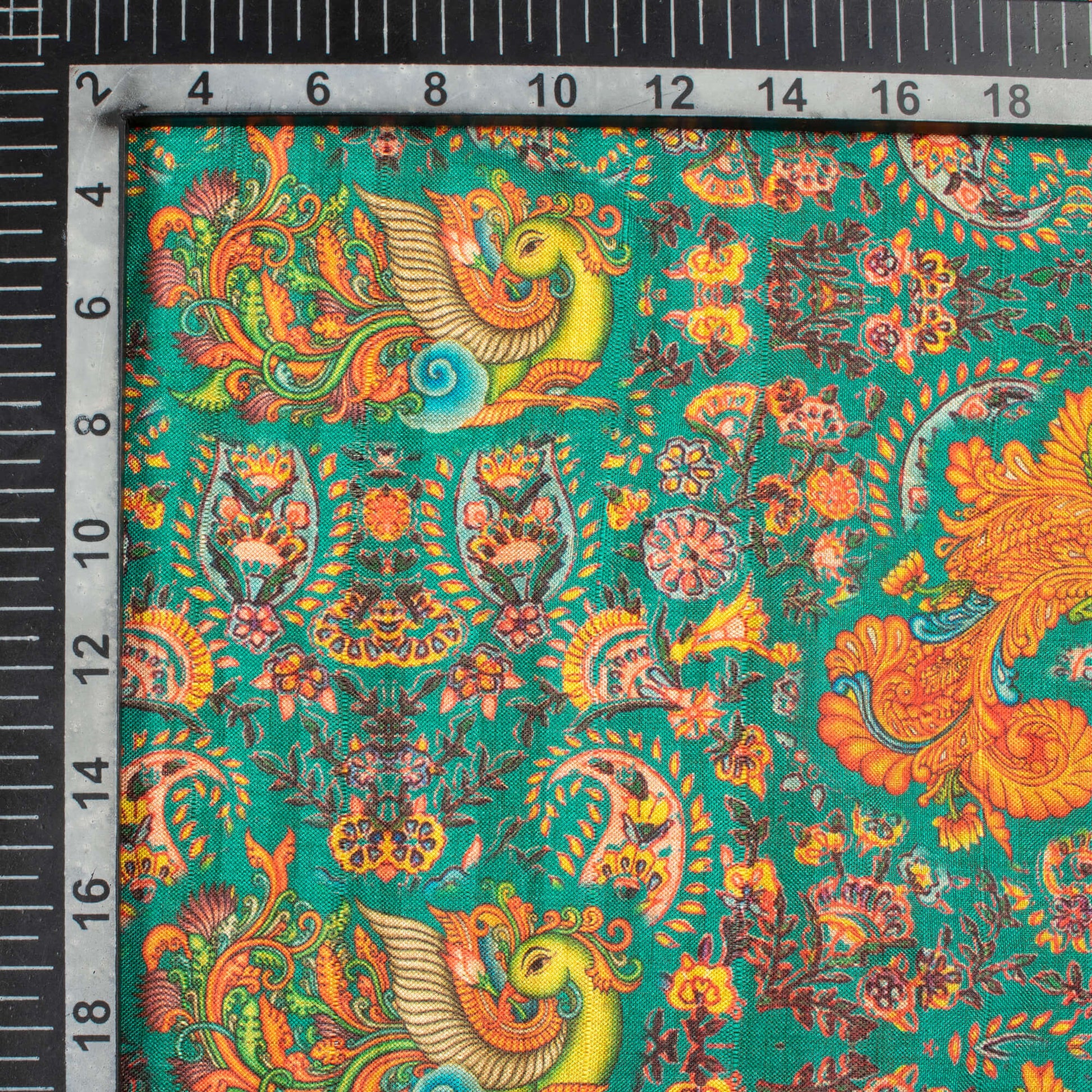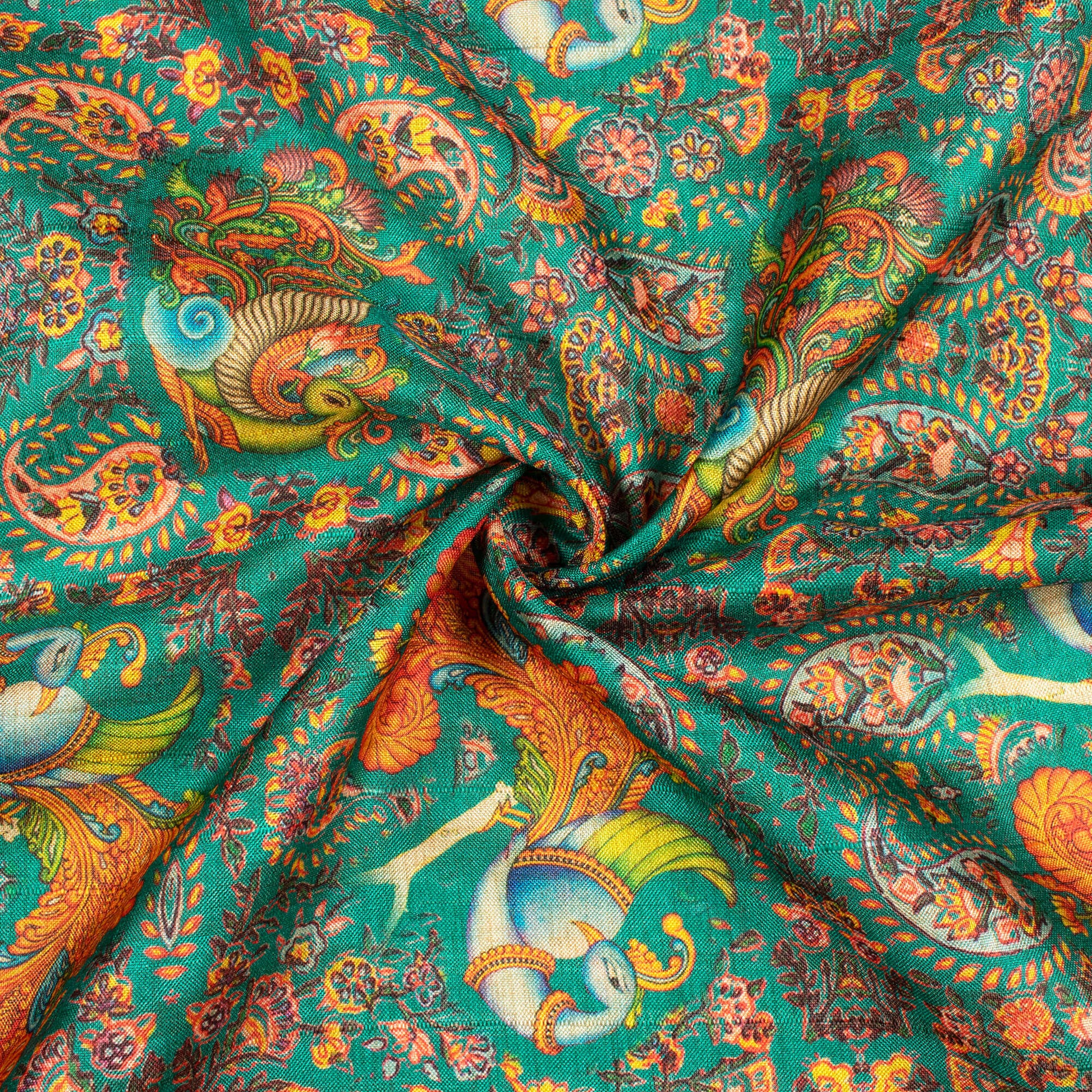 Peacock Green And Orange Madhuvanii Pattern Digital Print Art Tusser Silk Fabric