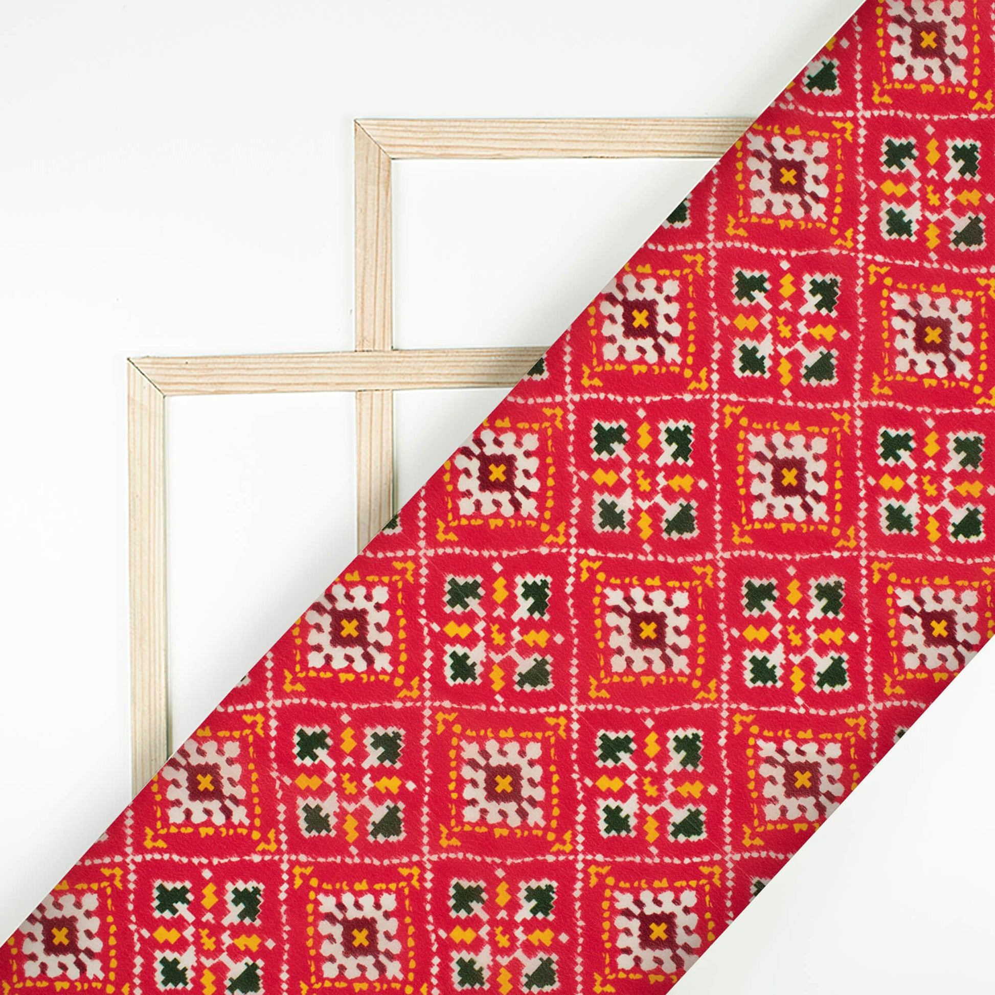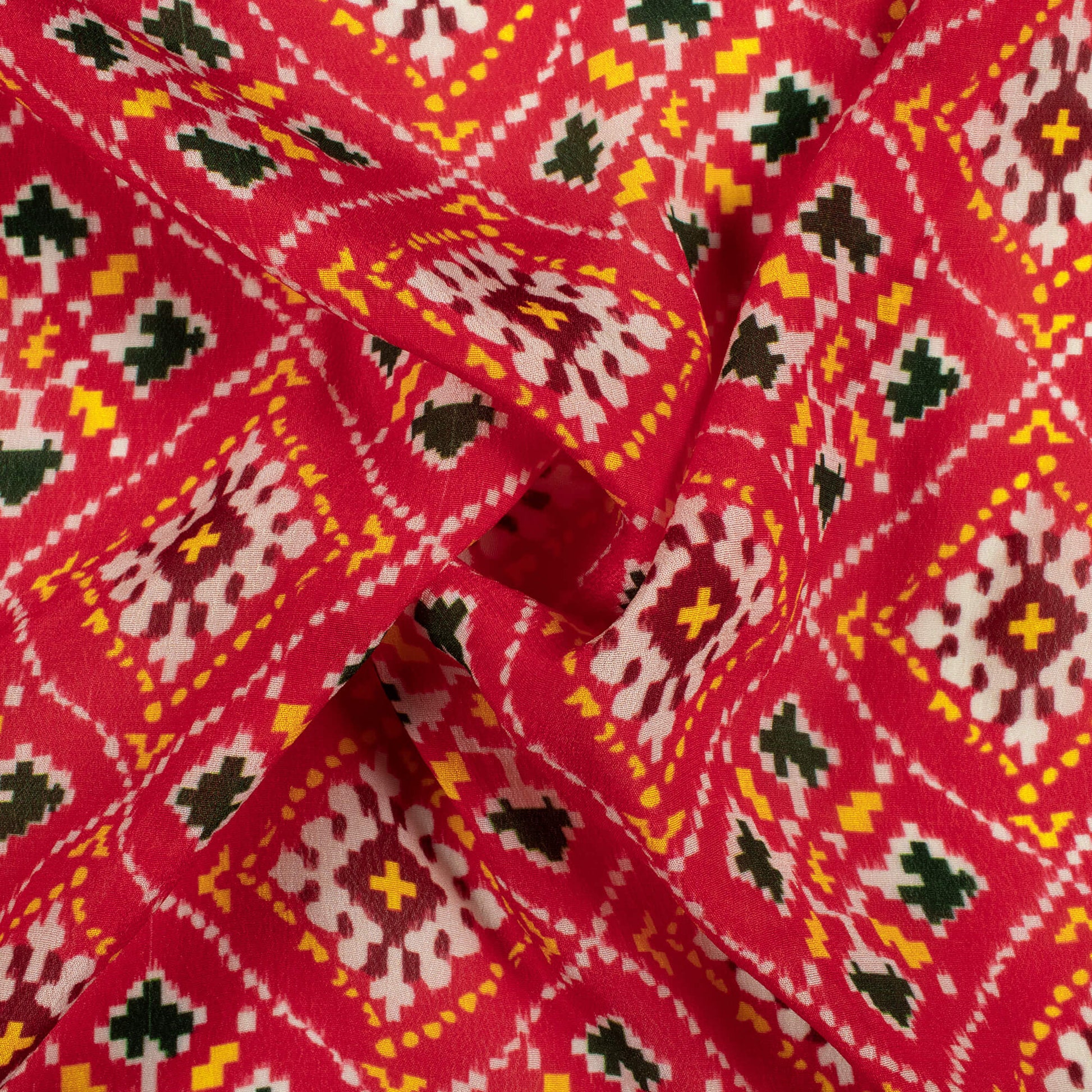 Vermilion Red And Dark Green Patolaa Pattern Digital Print Viscose Natural Crepe Fabric