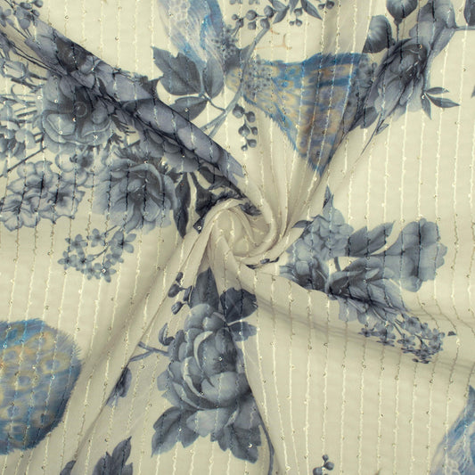 Oat Beige And Dolphin Grey Peacock Feather Pattern Digital Print Premium Sequins Georgette Fabric Oat Beige And Dolphin Grey Peacock Feather Pattern Digital Print Premium Sequins Georgette Fabric