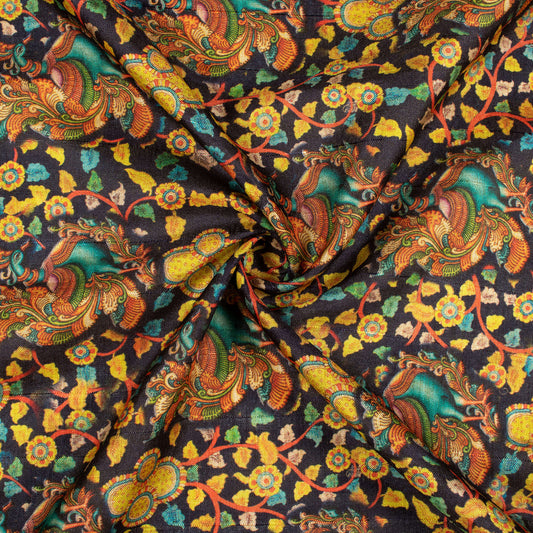 Black And Bumblebee Yellow Madhuvanii Pattern Digital Print Art Tusser Silk Fabric Black And Bumblebee Yellow Madhuvanii Pattern Digital Print Art Tusser Silk Fabric