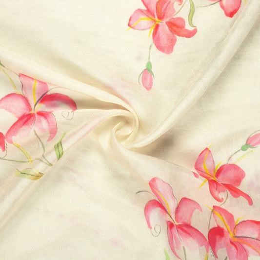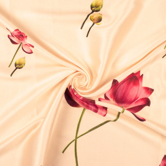 Ivory Cream And Lotus Pink Floral Pattern Digital Print Lush Satin Fabric Ivory Cream And Lotus Pink Floral Pattern Digital Print Lush Satin Fabric