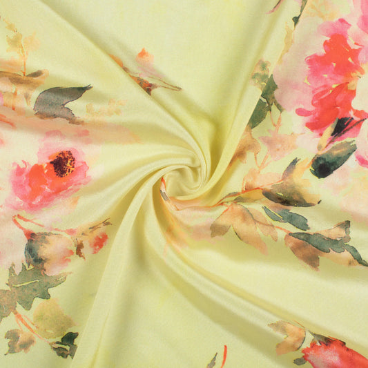 Dijon Yellow And Pink Floral Pattern Digital Print Pure Georgette Fabric Dijon Yellow And Pink Floral Pattern Digital Print Pure Georgette Fabric
