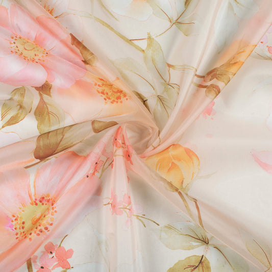 Light Orange And Cherry Pink Floral Pattern Digital Print Organza Satin Fabric Light Orange And Cherry Pink Floral Pattern Digital Print Organza Satin Fabric