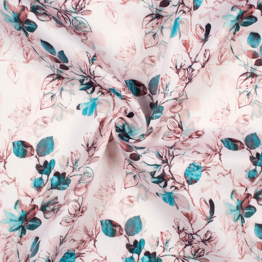 Pearl White And Teal Blue Floral Pattern Digital Print Poly Glazed Cotton Fabric Pearl White And Teal Blue Floral Pattern Digital Print Poly Glazed Cotton Fabric