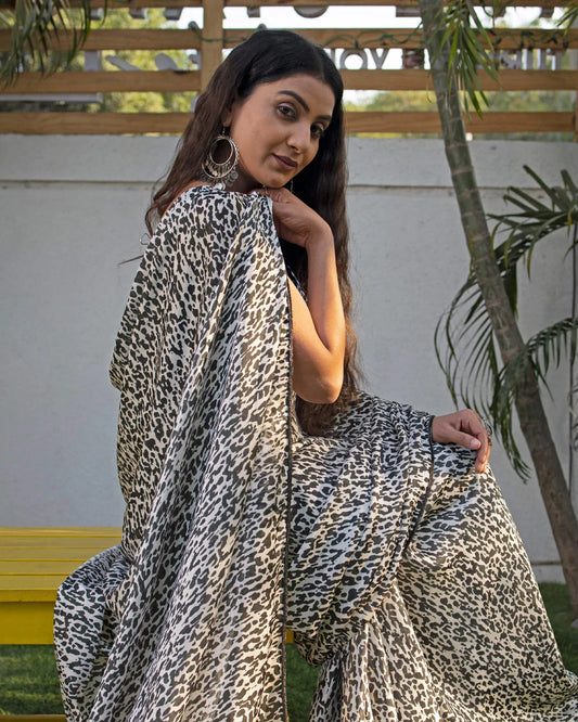 -10% offBlack And Cream Animal Pattern Digital Print Crepe Silk Saree With Lace Border Black And Cream Animal Pattern Digital Print Crepe Silk Saree With Lace Border