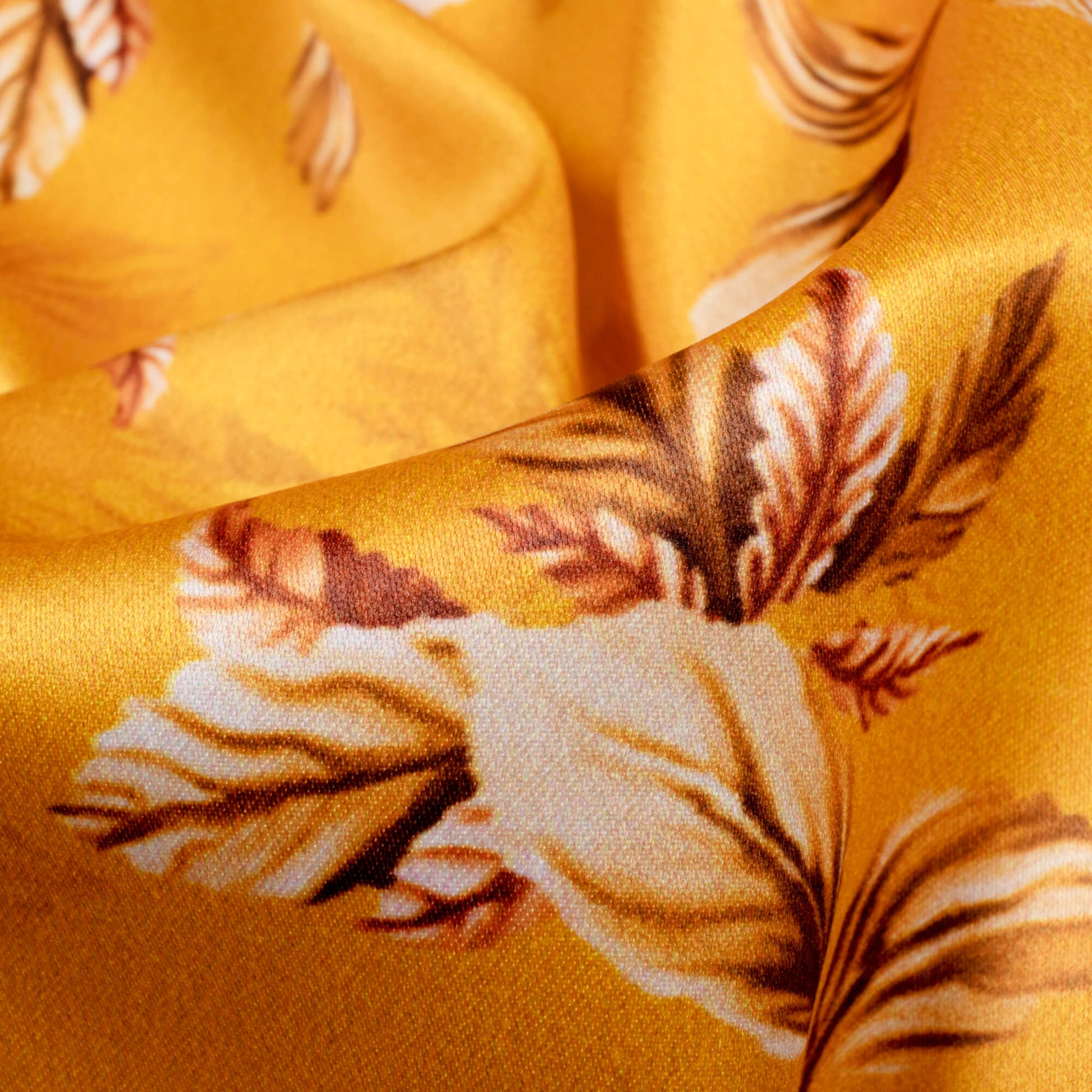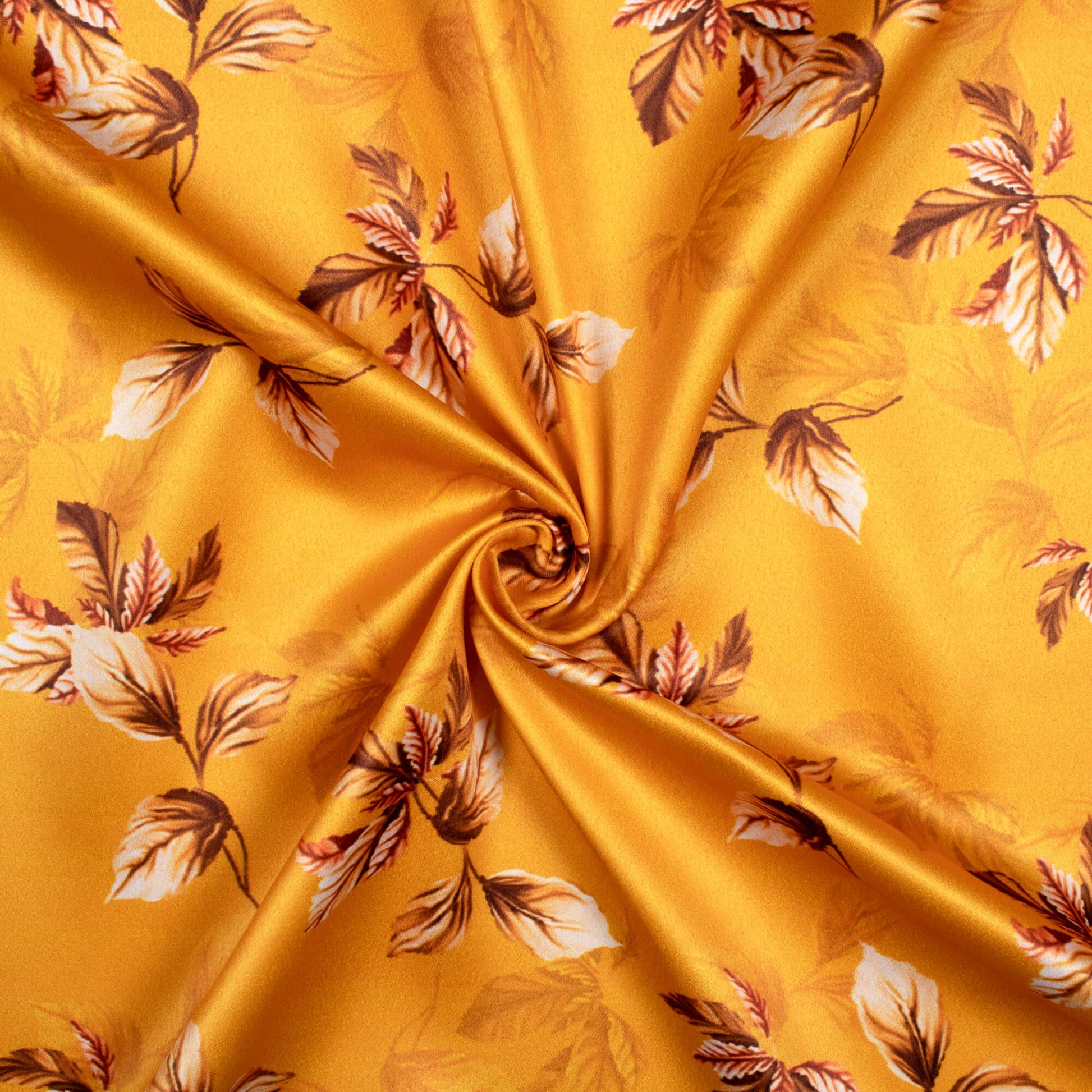 Fire Yellow And Brown Leaf Pattern Digital Print Charmeuse Satin Fabric (Width 58 Inches)