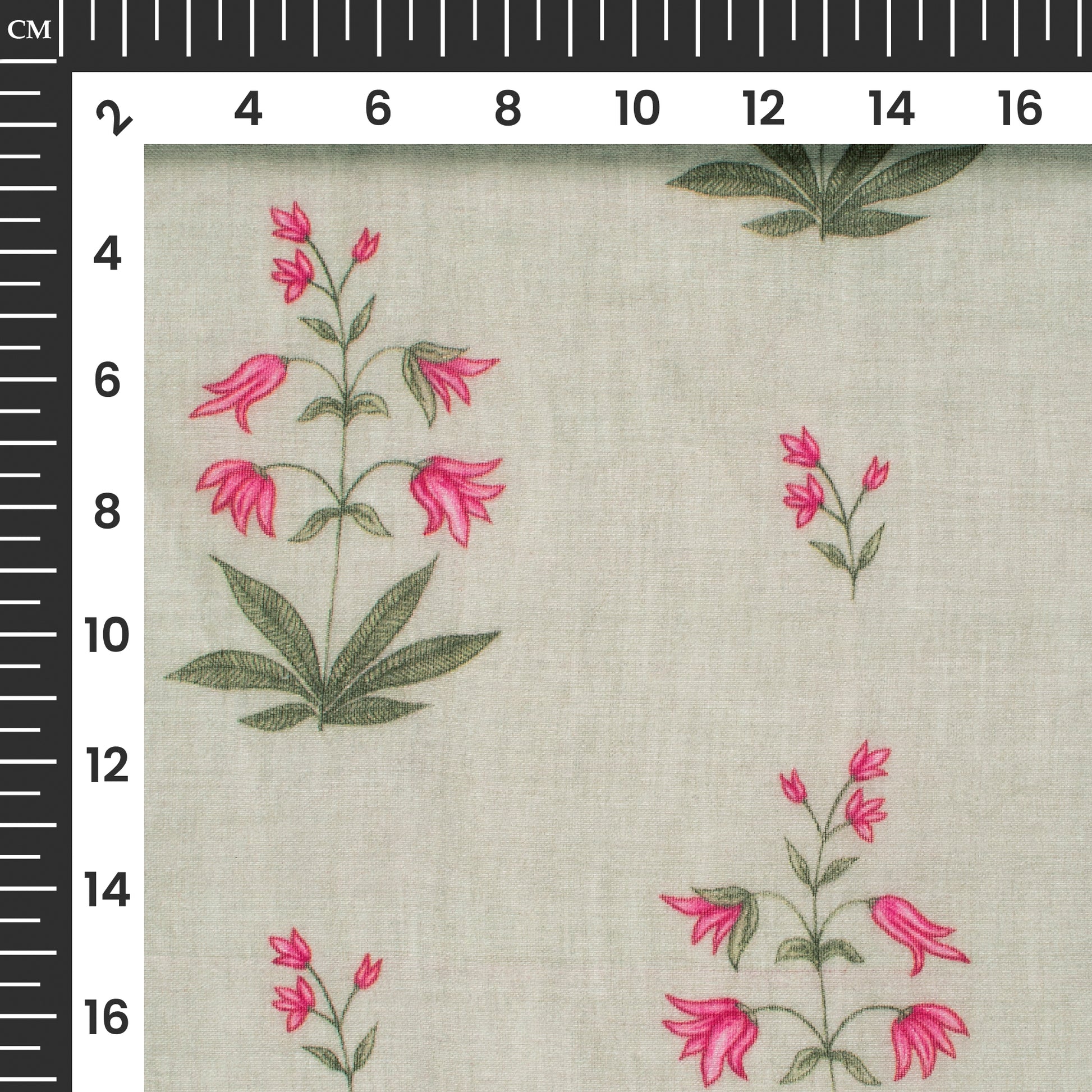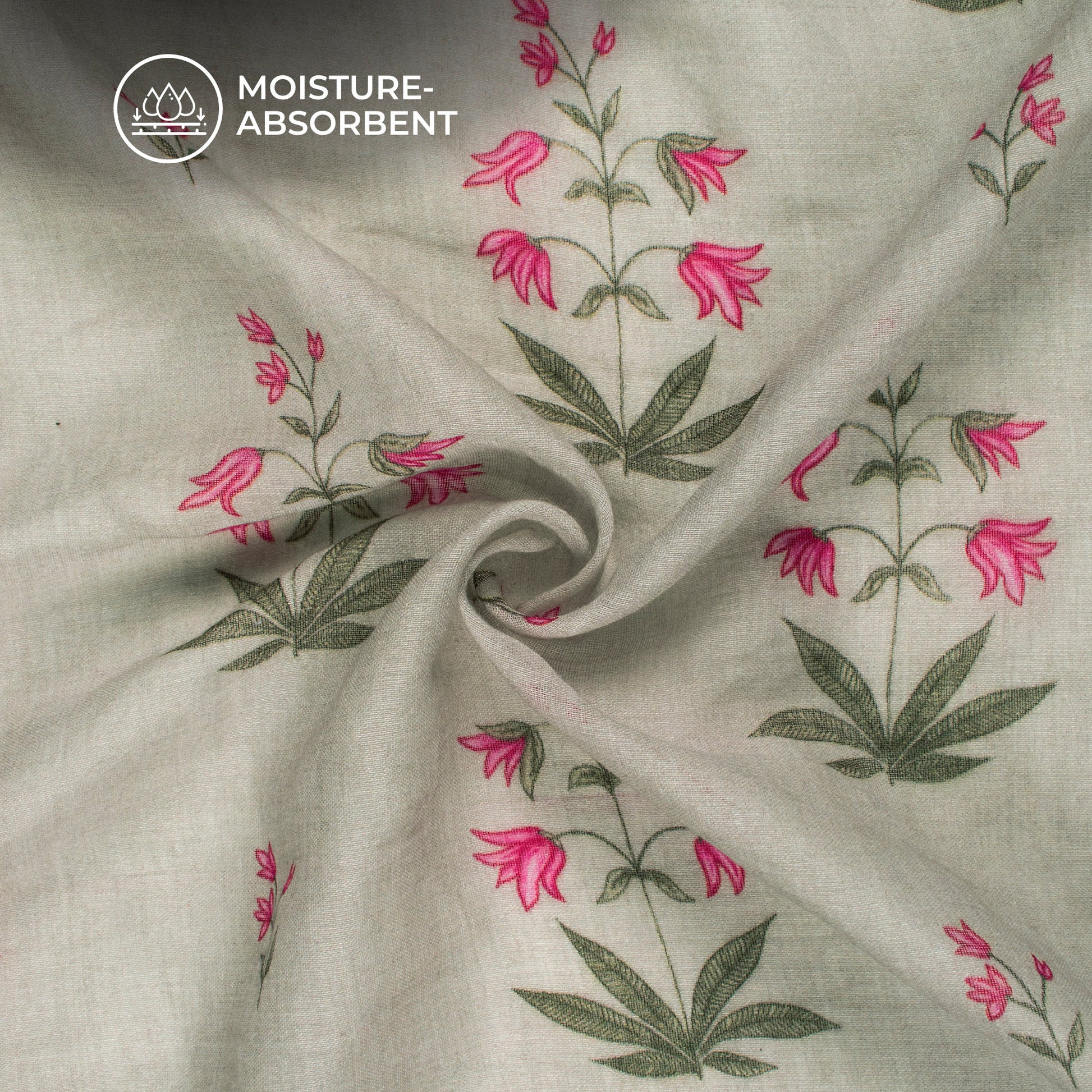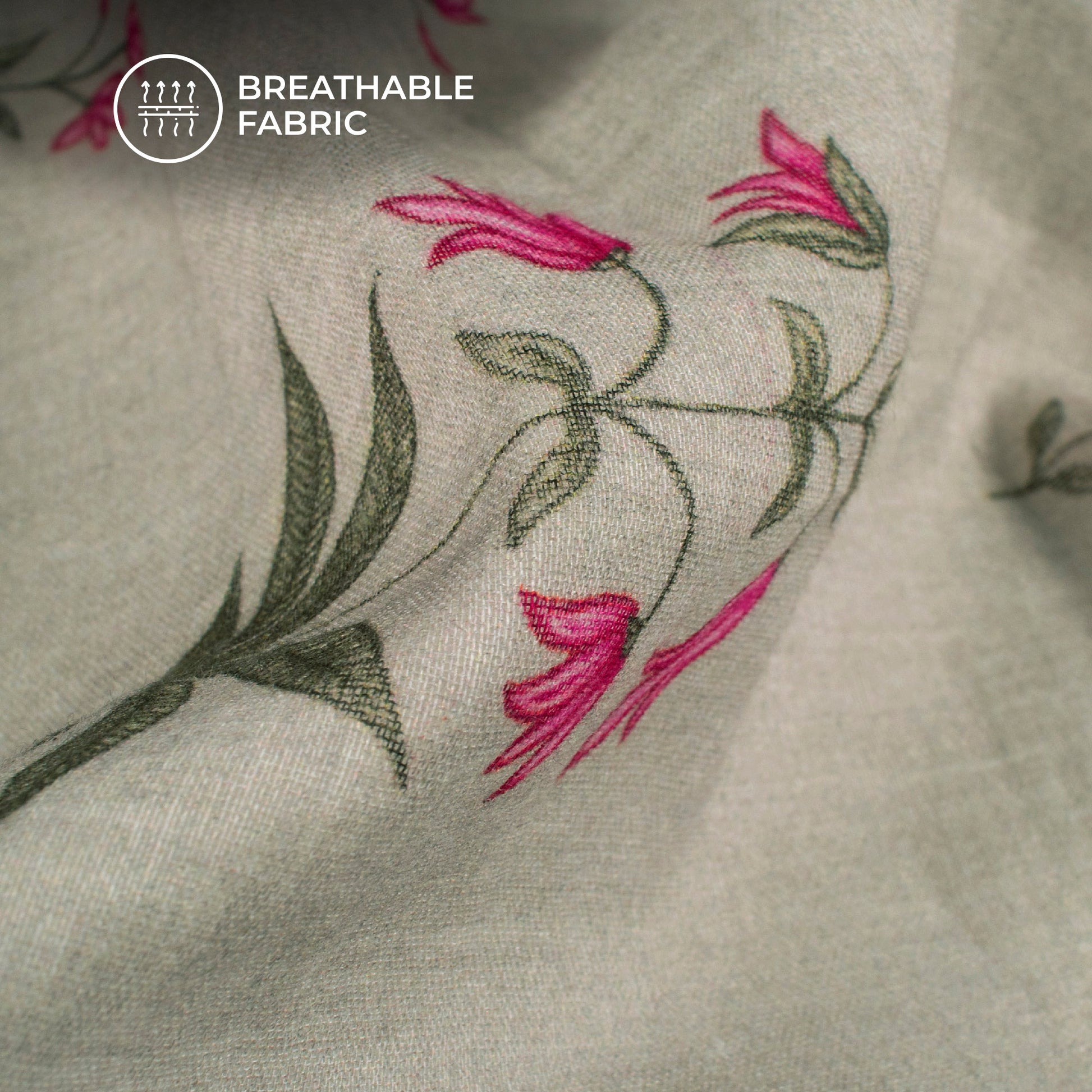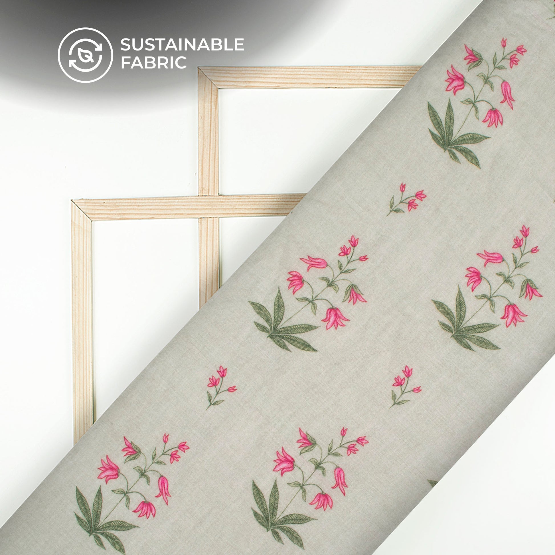 Koala Grey And Pink Floral Digital Print Pure Cotton Mulmul Fabric