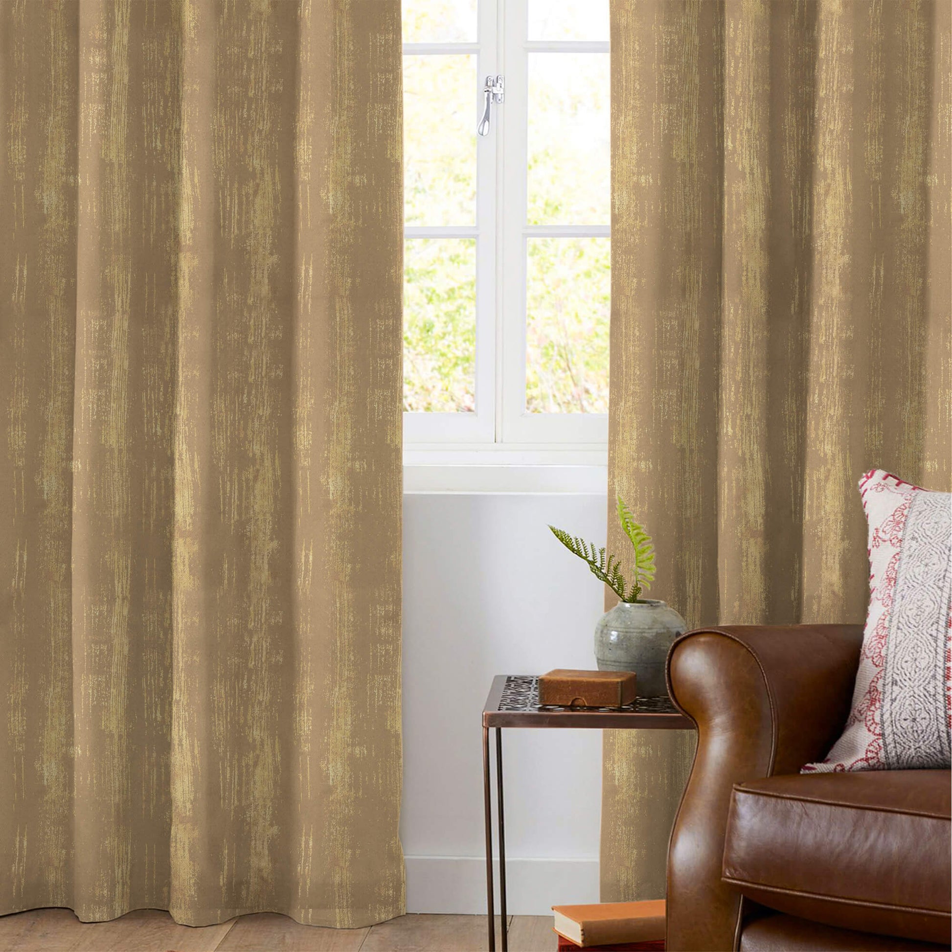Brown Texture Pattern Golden Foil Premium Curtain Fabric (Width 54 Inches)