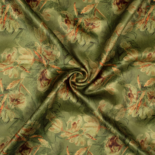 Olive Green Floral Pattern Digital Print Lush Satin Fabric Olive Green Floral Pattern Digital Print Lush Satin Fabric