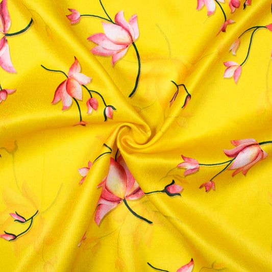 Bumblebee Yellow And Pink Floral Pattern Digital Print Lush Satin Fabric Bumblebee Yellow And Pink Floral Pattern Digital Print Lush Satin Fabric
