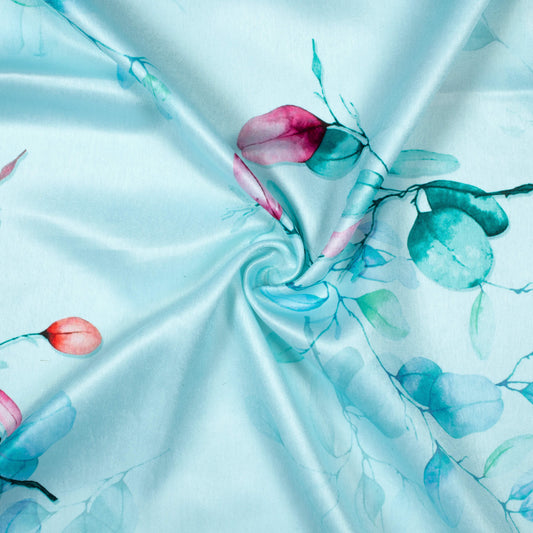 Sky Blue And Pink Floral Pattern Digital Print Lush Satin Fabric Sky Blue And Pink Floral Pattern Digital Print Lush Satin Fabric