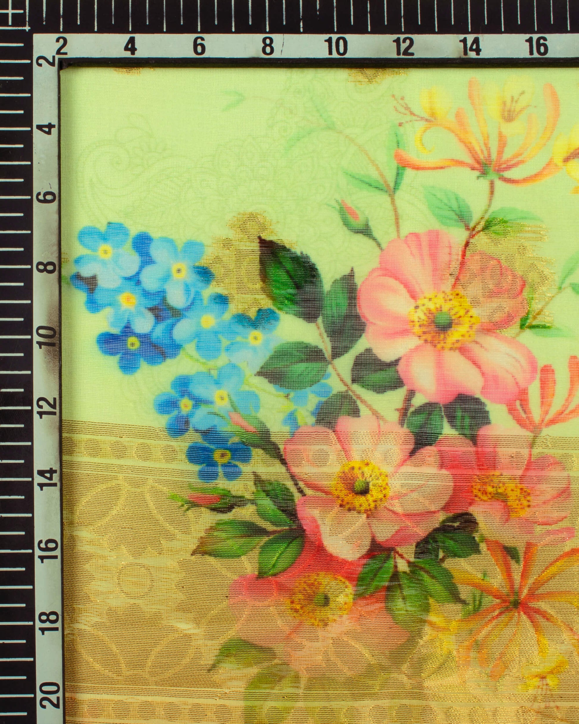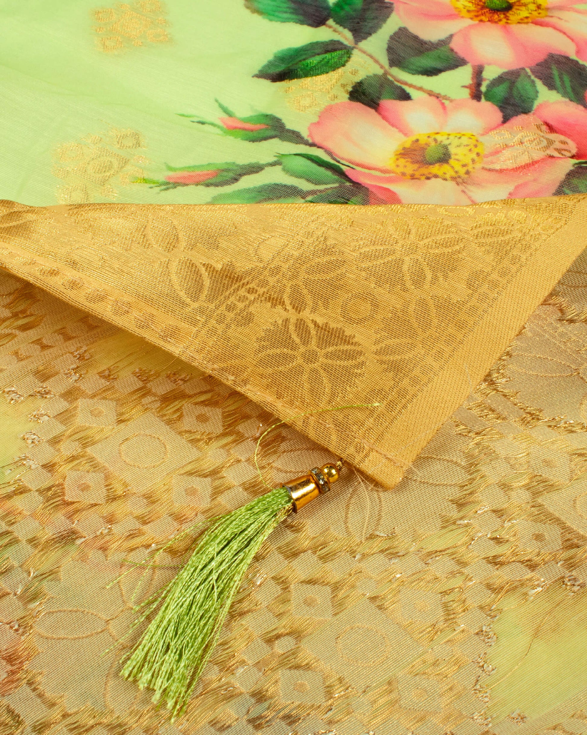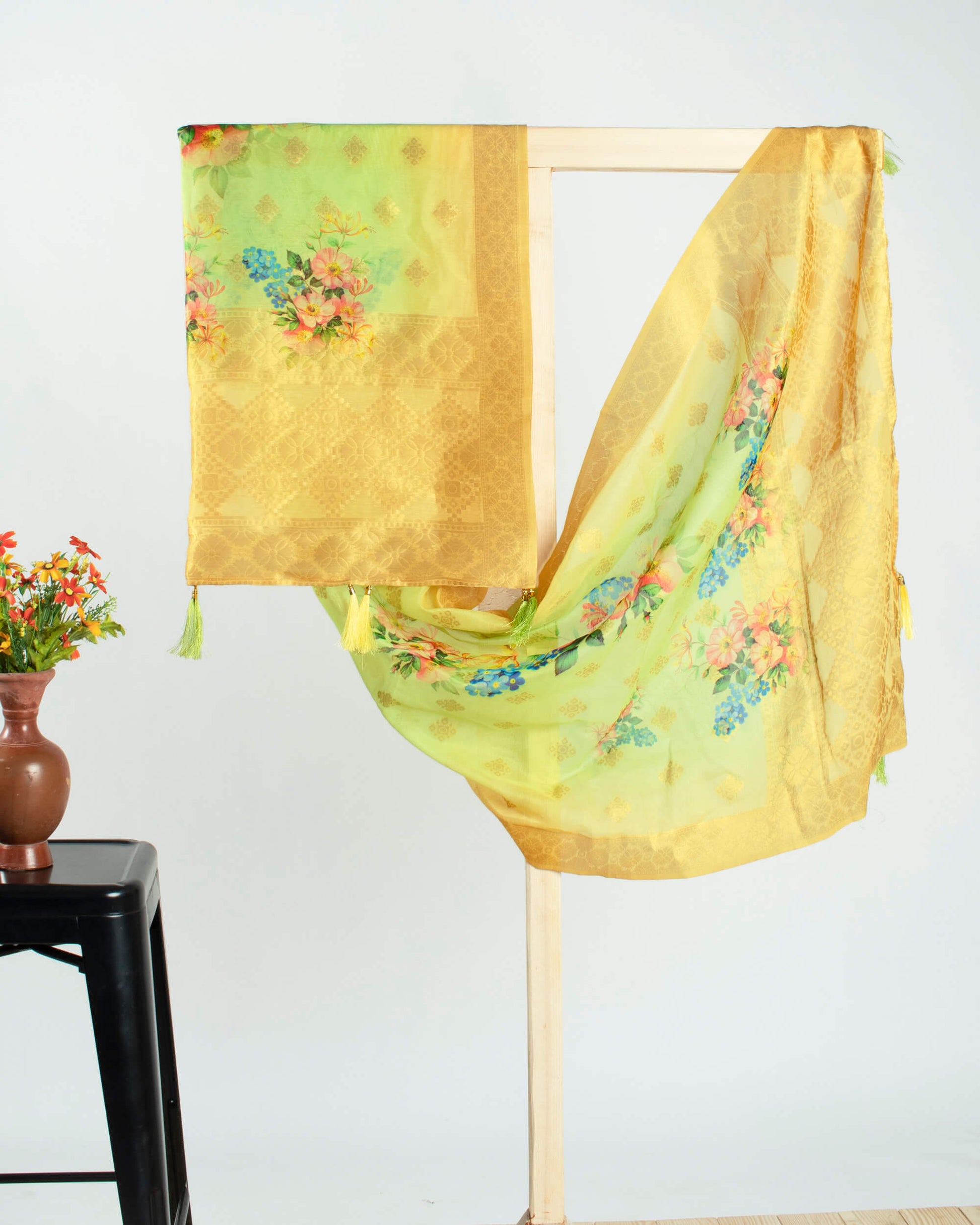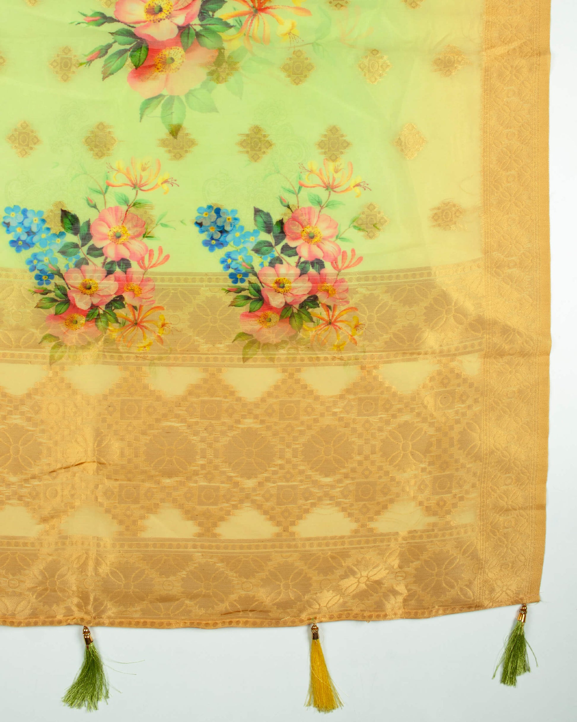 Beige And Mint Green Floral Pattern Digital Print Zari Jacquard Chanderi Dupatta With Tassles