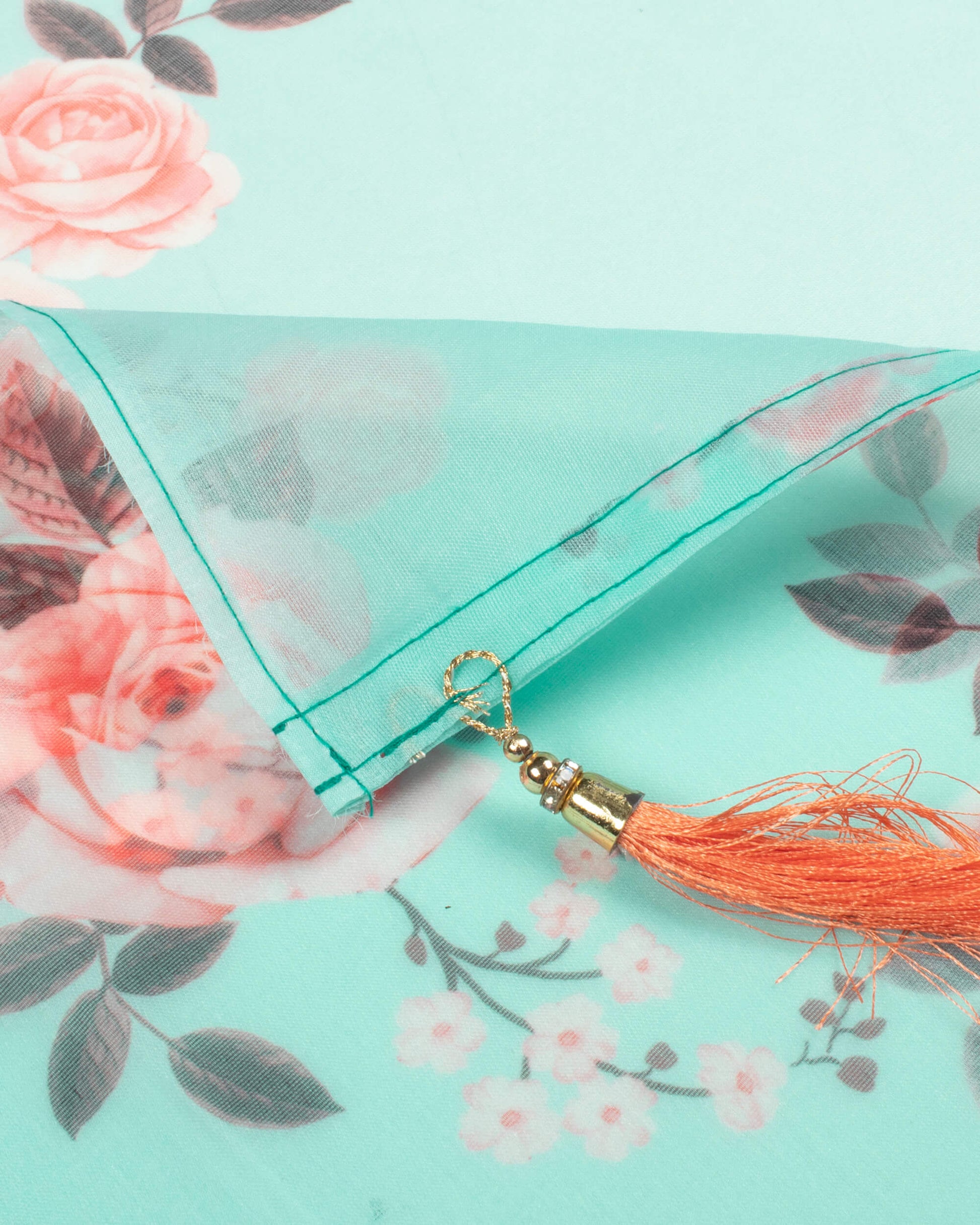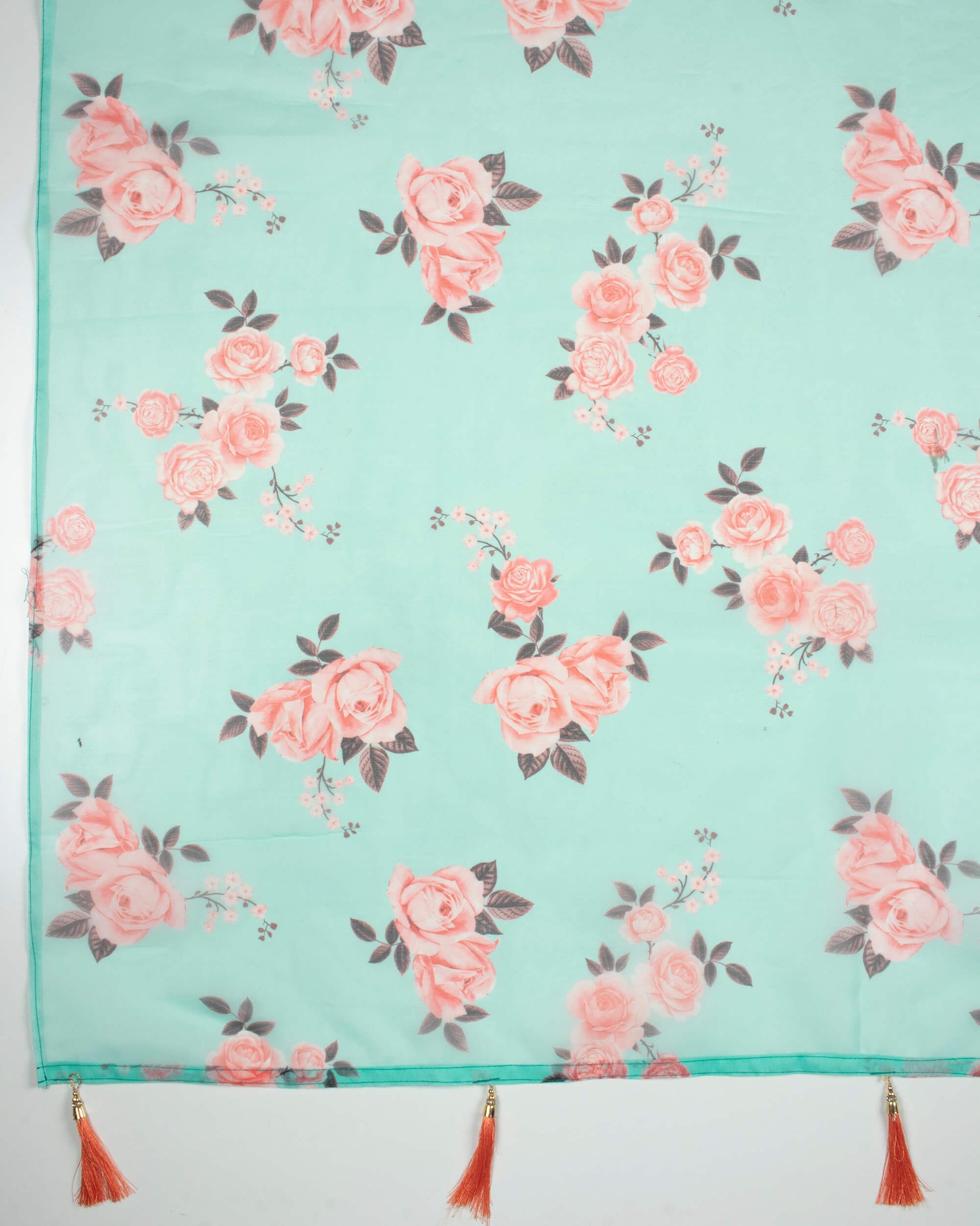 Celeste Blue And Pink Floral Pattern Digital Print Organza Dupatta With Tassels