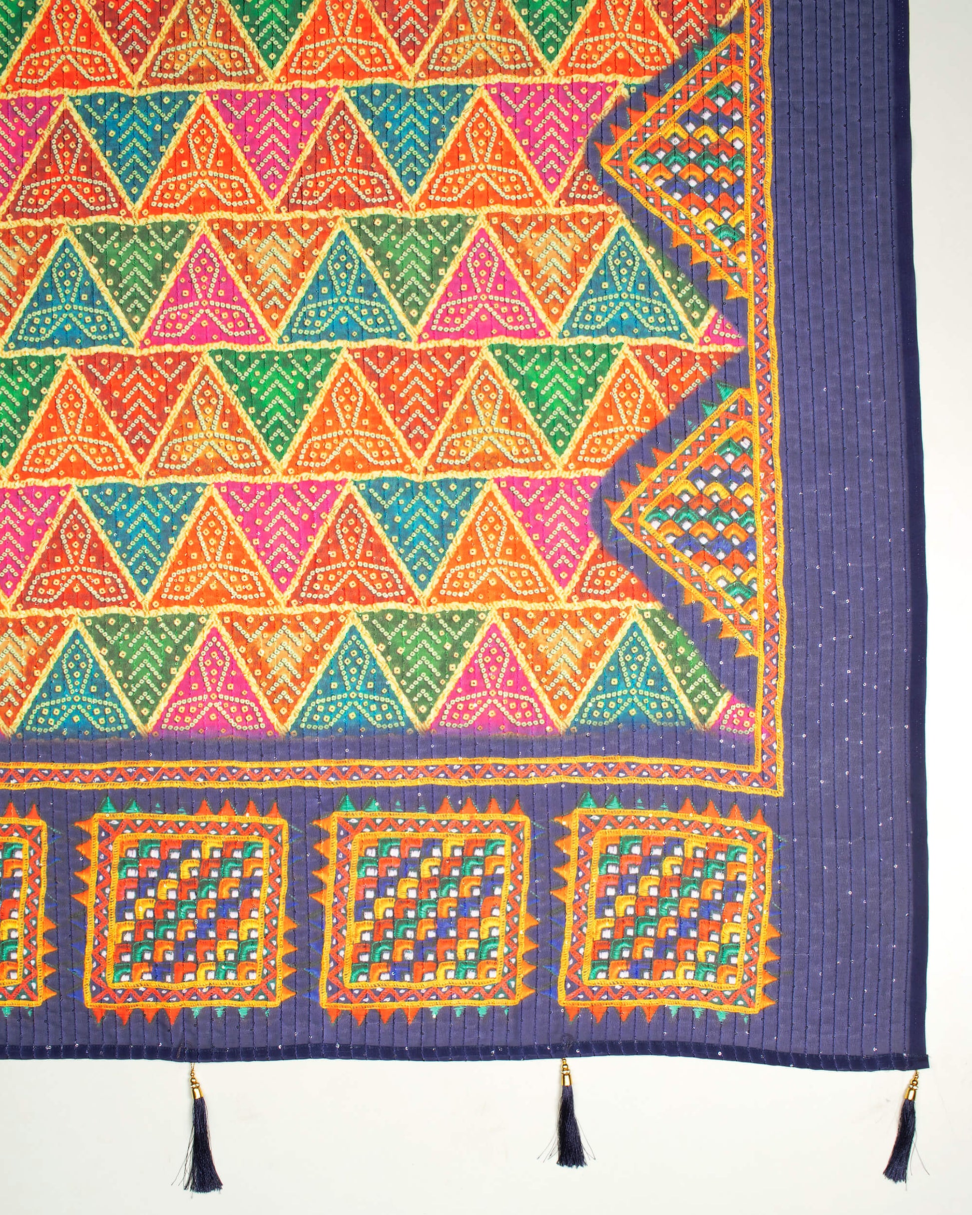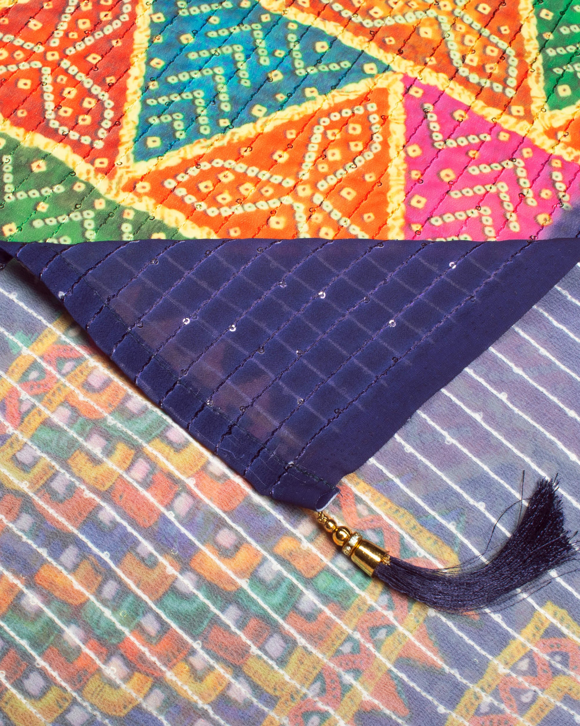 Indigo Blue And Orange Bandhanii Pattern Digital Print Sequins Georgette Dupatta With Tassels