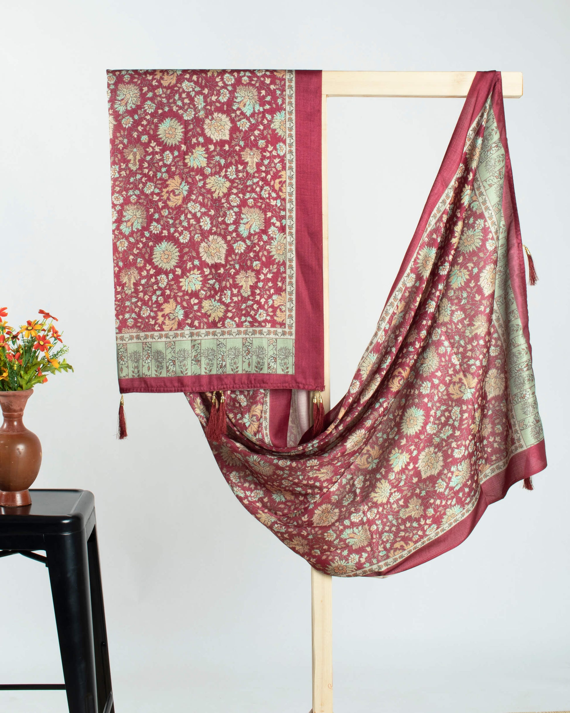 Maroon And Mellow Yellow Floral Pattern Digital Print Gadwal Silk Dupatta With Tassels