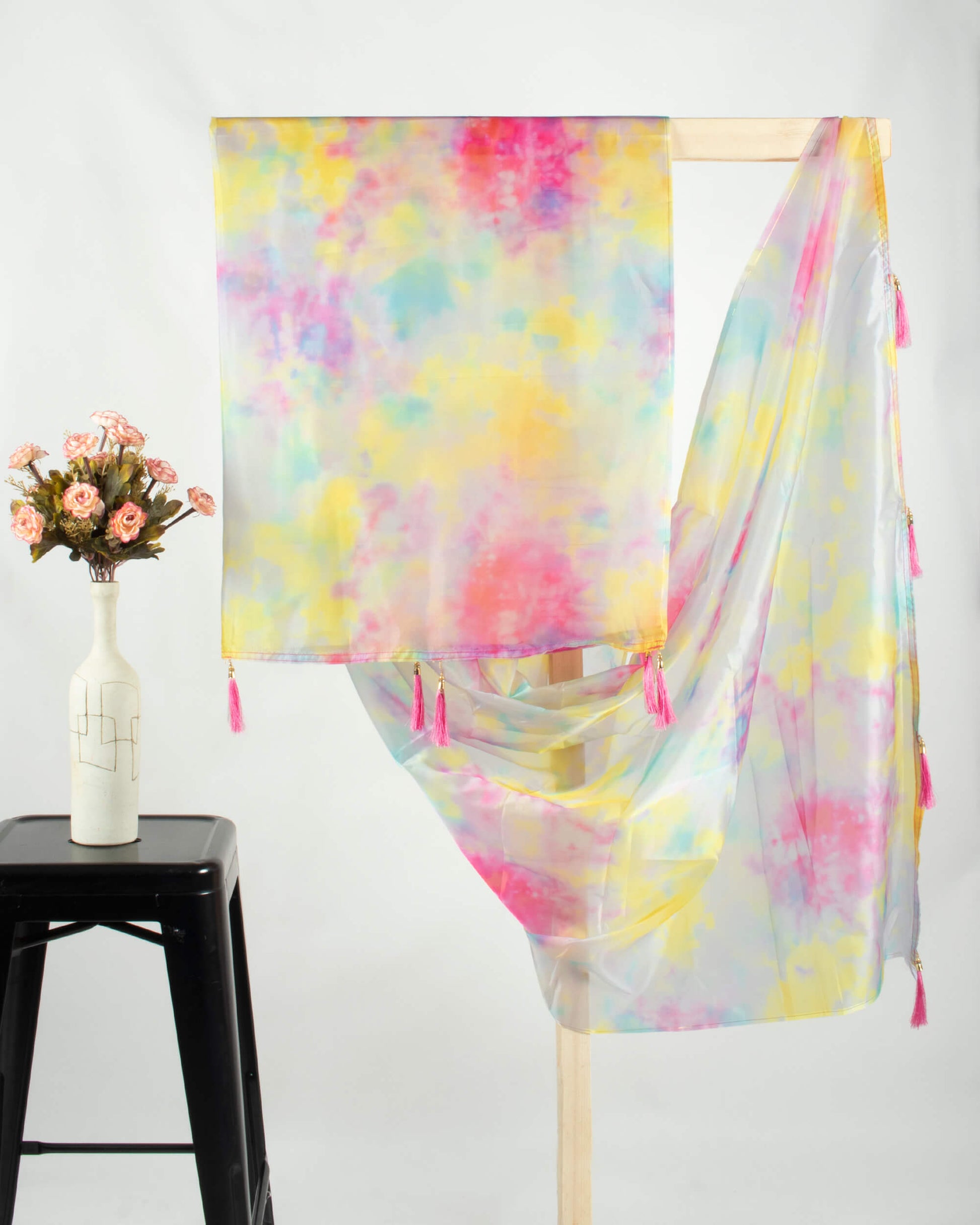 Pink And Yellow Tye And Dye Pattern Digital Print Organza Satin Dupatta With Tassels