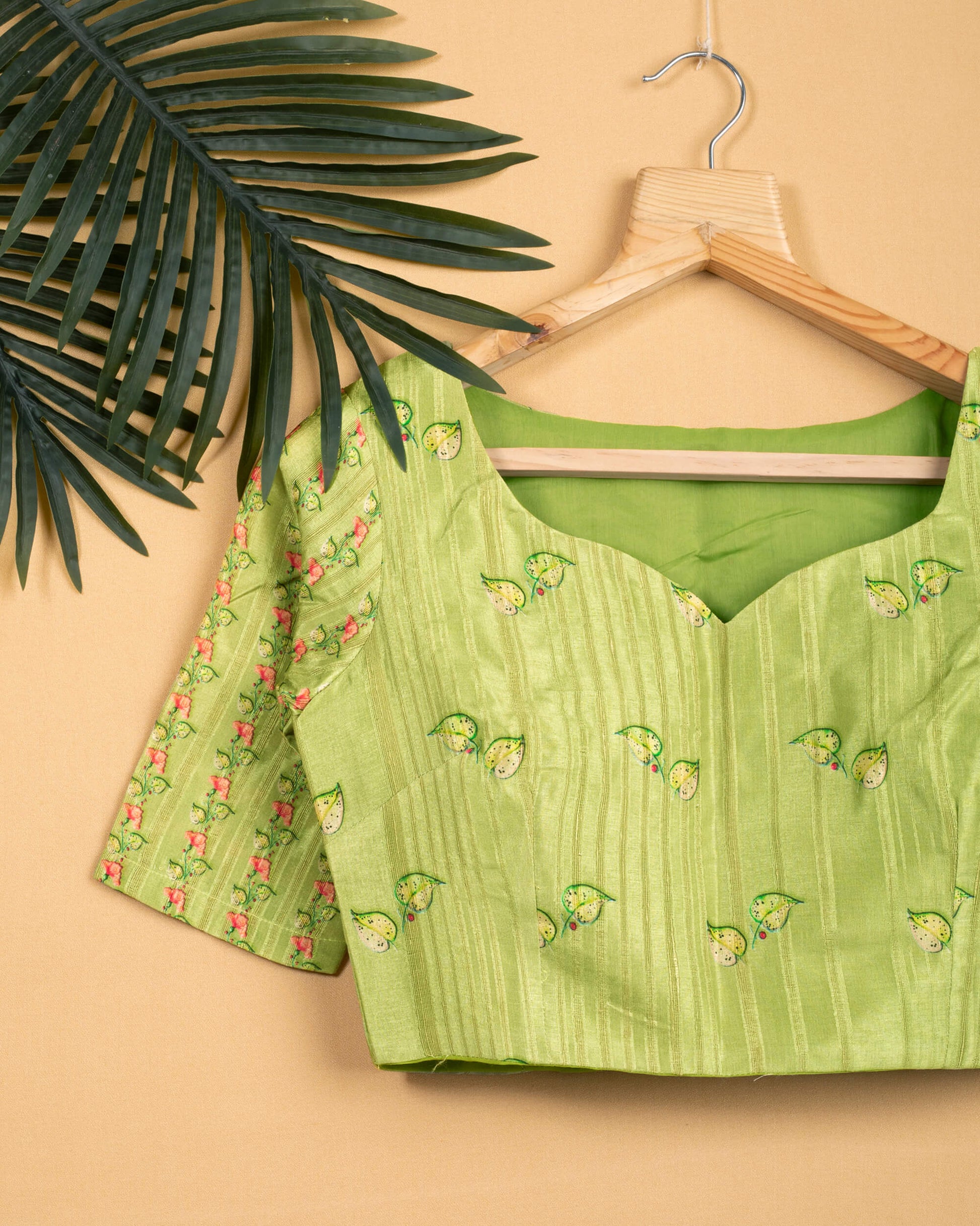 Heritage Art Silk Blouse looks sumptuous and has a fine pattern formed on it. It features a side zip, half sleeve and has a sweetheart neckline. This fabric is soft, luxrious and gives you a royal feeling. Match it with your favorite saree and this blouse won't disappoint you.
