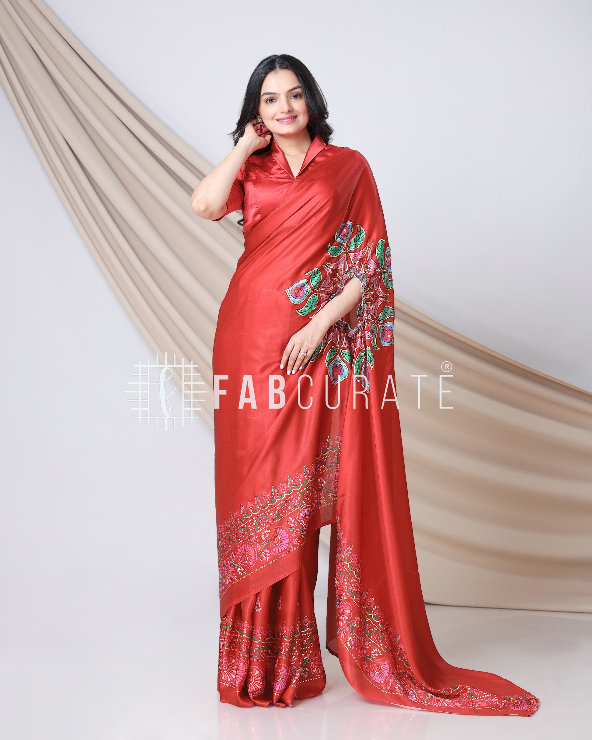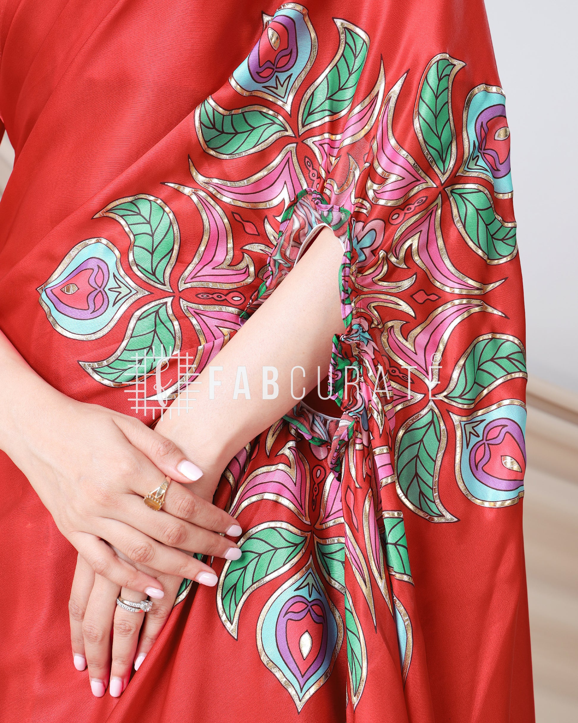 Yes, you read that right! This foil work saree features a cleverly designed hole in the pallu. This innovative feature allows you to drape and secure your pallu without the need for constant adjustments, freeing your hands for other tasks. Enjoy the grace of a perfectly draped saree, completely handsfree! Experience the future of saree draping with the Handsfree Mandala Saree. It's not just a garment; it's a game-changer.