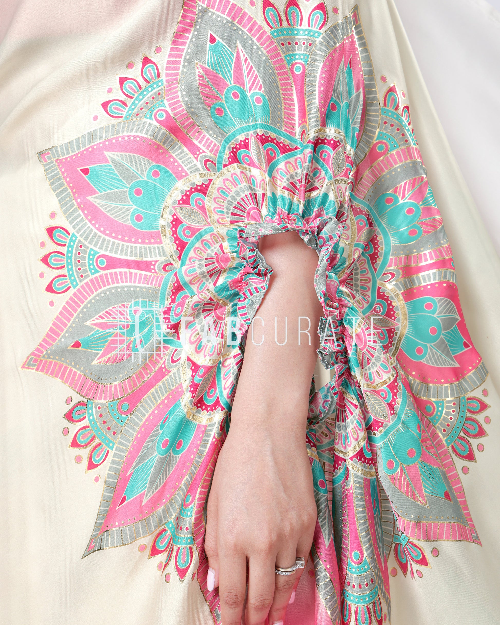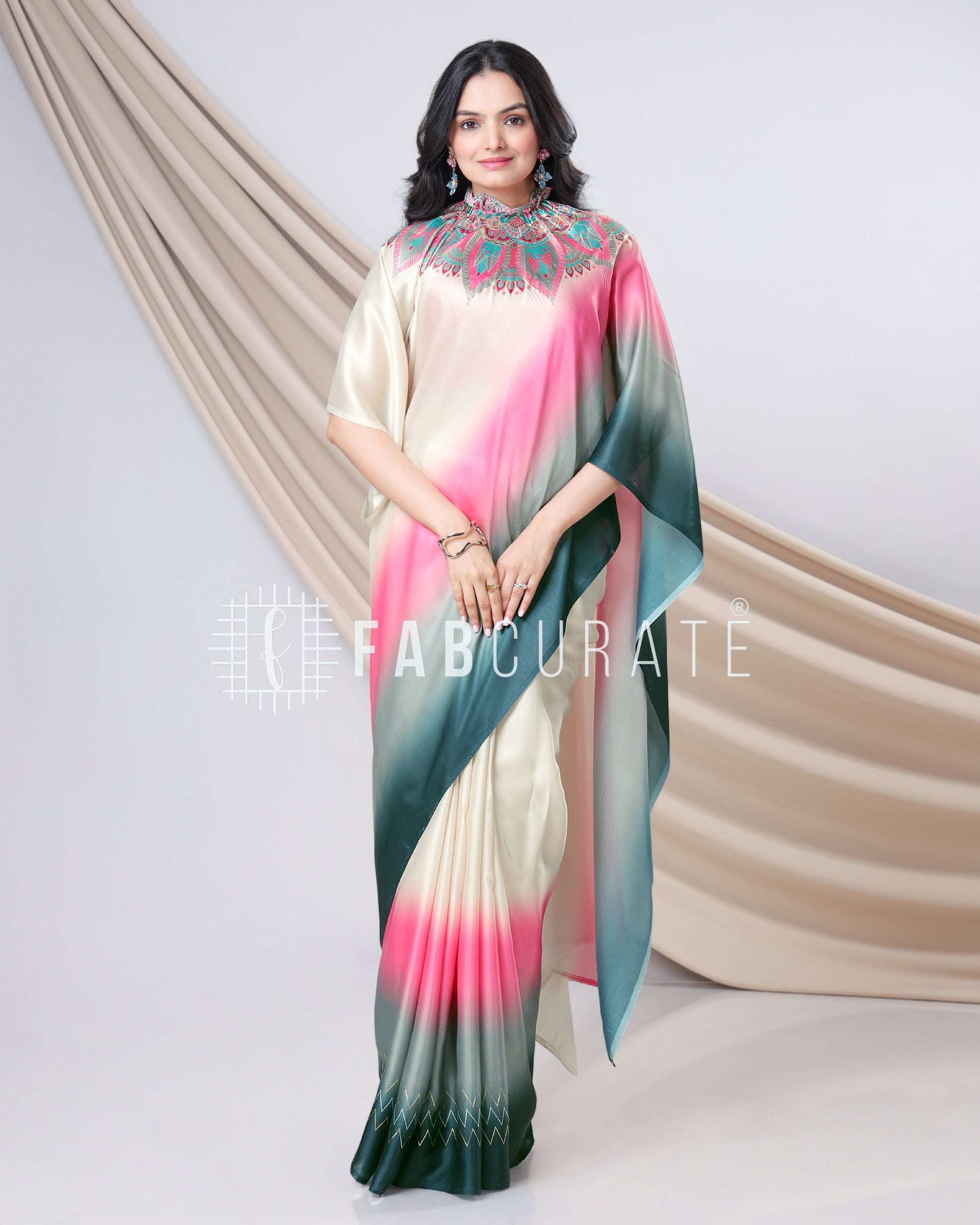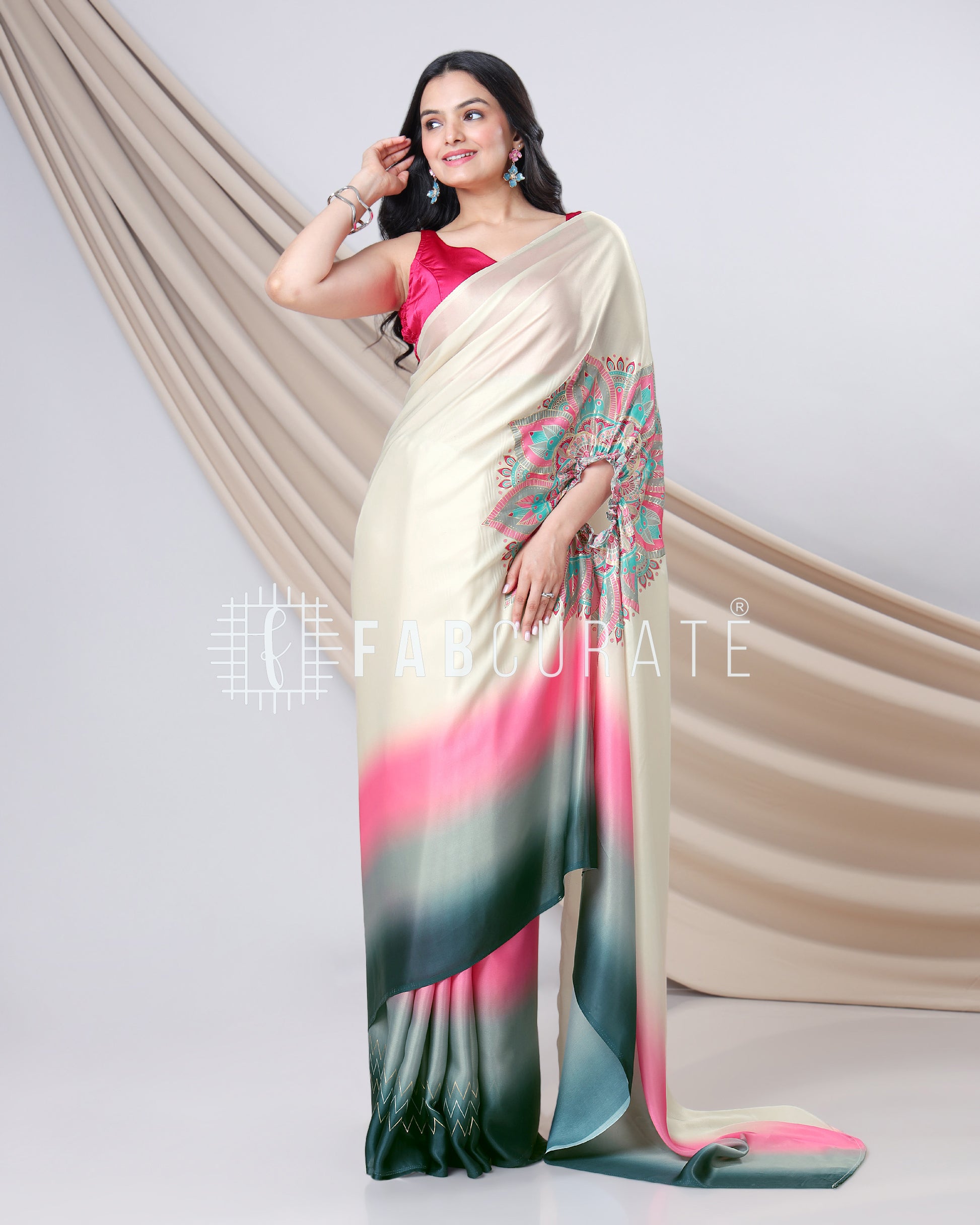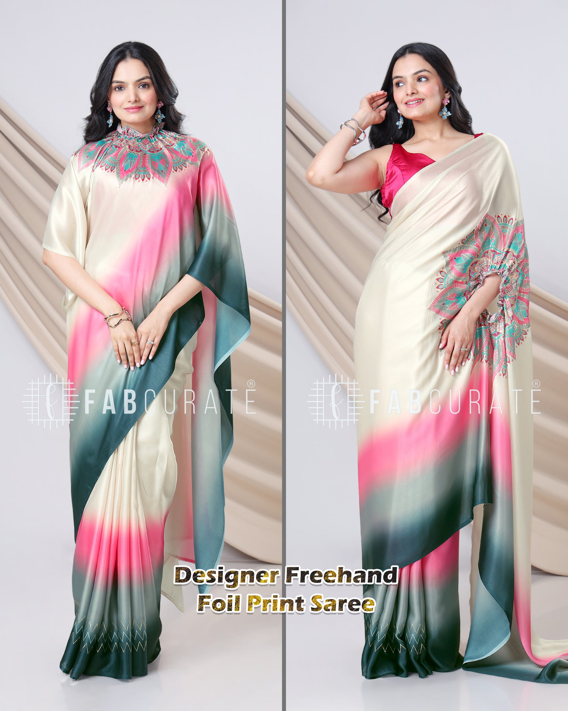Yes, you read that right! This foil work saree features a cleverly designed hole in the pallu. This innovative feature allows you to drape and secure your pallu without the need for constant adjustments, freeing your hands for other tasks. Enjoy the grace of a perfectly draped saree, completely handsfree! Experience the future of saree draping with the Handsfree Mandala Saree. It's not just a garment; it's a game-changer.