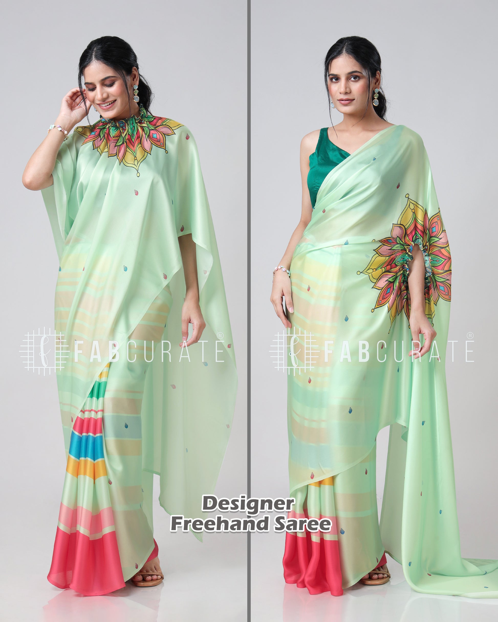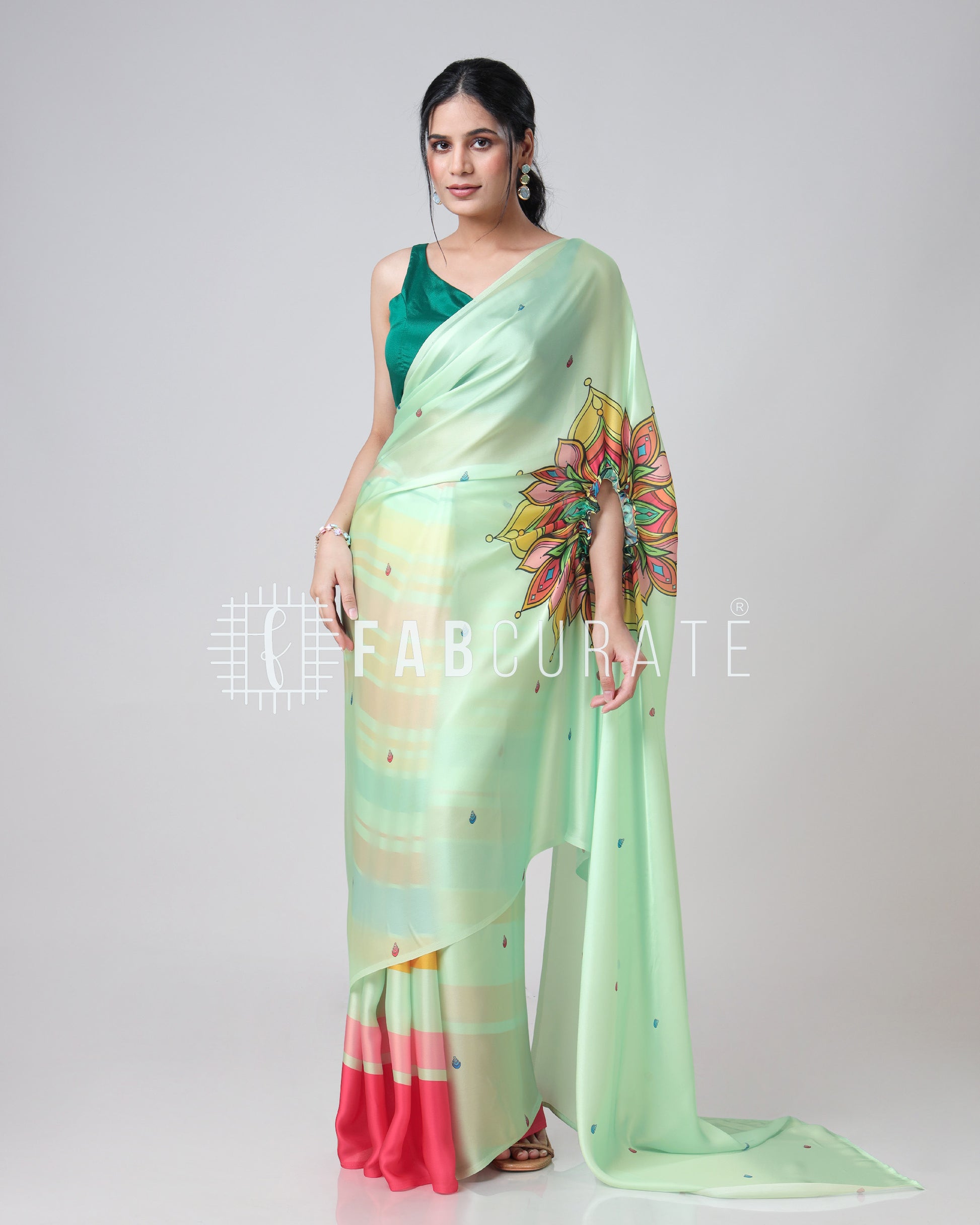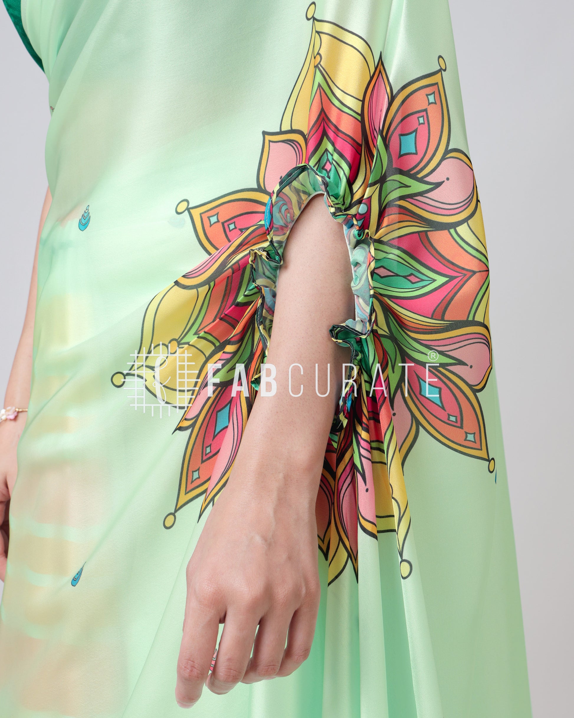 Yes, you read that right! This saree features a cleverly designed hole in the pallu. This innovative feature allows you to drape and secure your pallu without the need for constant adjustments, freeing your hands for other tasks. Enjoy the grace of a perfectly draped saree, completely handsfree! Experience the future of saree draping with the Handsfree Mandala Saree. It's not just a garment; it's a game-changer.