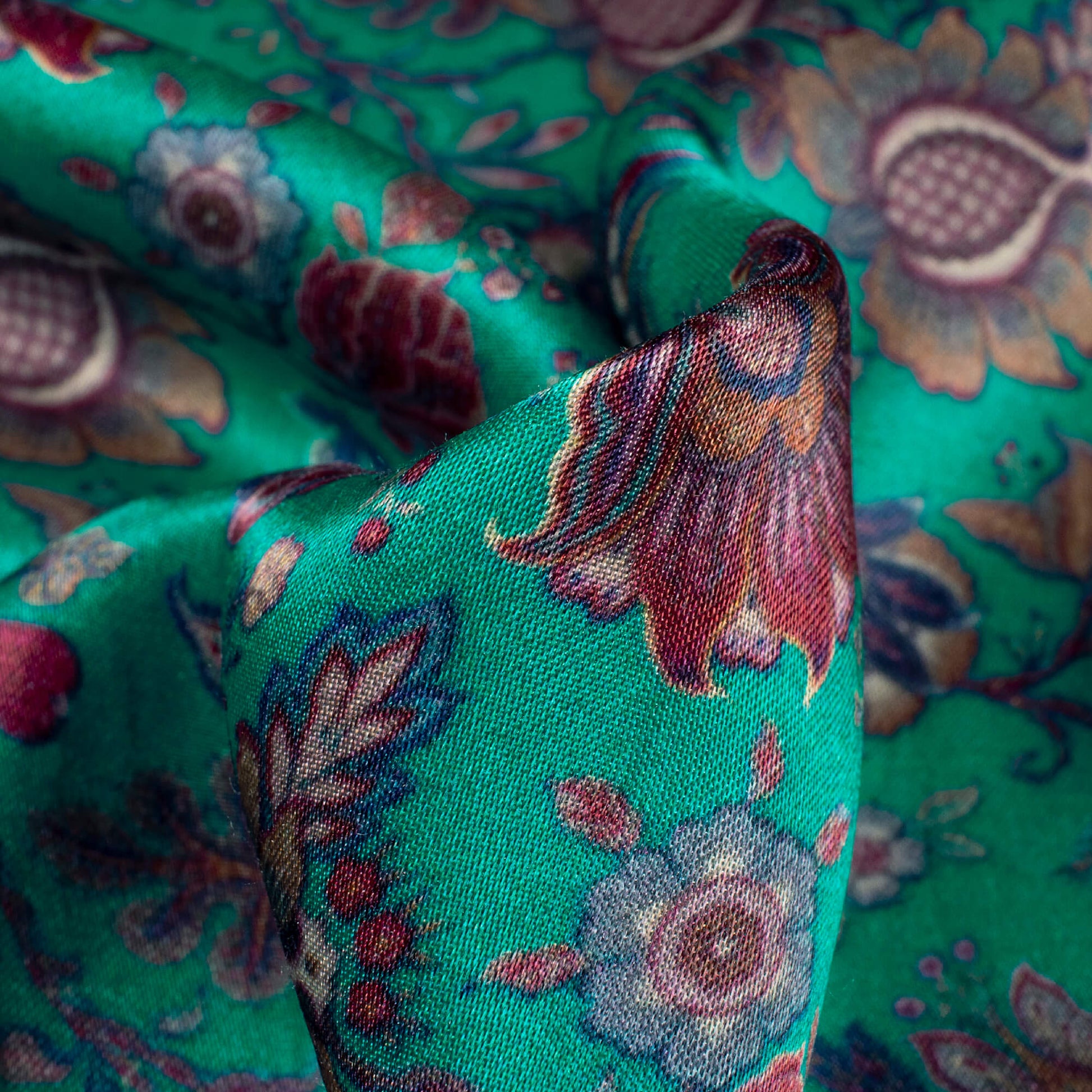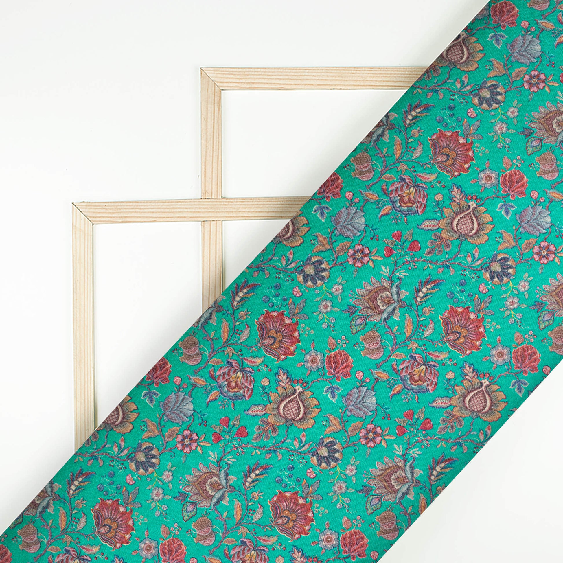 Dark Turquoise And Red Floral Pattern Digital Print Viscose Gaji Silk Fabric