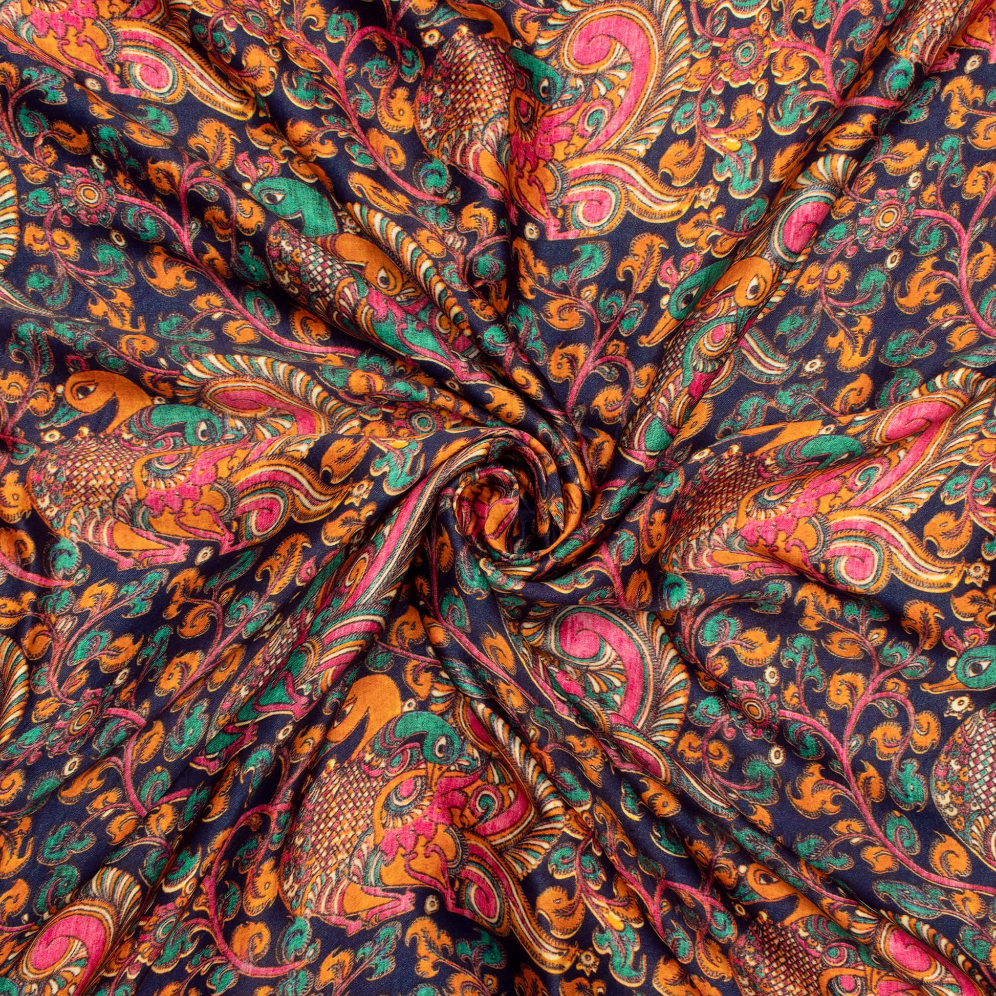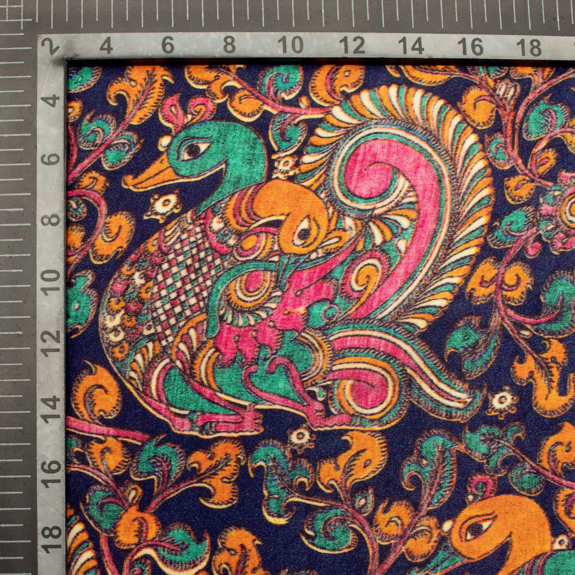 Prussian Blue And Hot Pink Kalamkrii Pattern Digital Print Viscose Gaji Silk Fabric