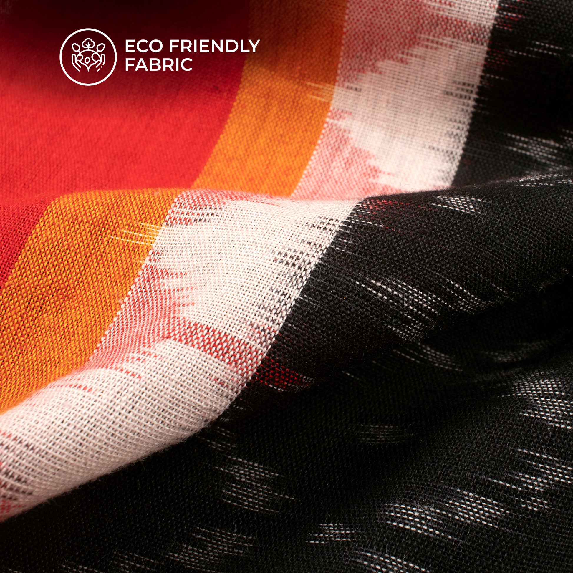 Fabcurate’s 2/60s Cotton Ikat collection is curated from the heritage town of Pochampally, where each yarn is pre-dyed before weaving to achieve the required finesse in design. Ikat is a symbiosis of colors and patterns in the textile world and is available in plethora of solid colors like – black, magenta, orange, blue, red and more. The yarn is woven with great skill to achieve the precise blurry zig-zag and rectangular patterns which we find in this fabric. The fabric can be used in creating any trendy home furnishings and apparels like dresses, Jackets, Skirts, Jumpsuits, Kurtis, Shirts etc.