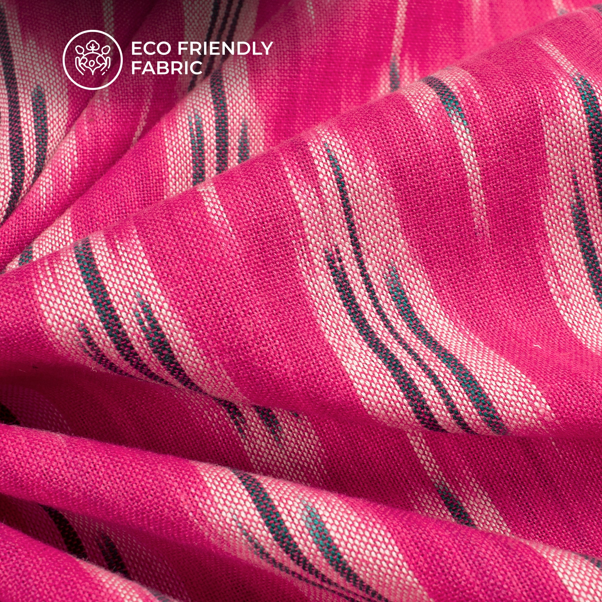 Fabcurate’s Cotton Ikat collection is curated from the heritage town of Pochampally, where each yarn is pre-dyed before weaving to achieve the required finesse in design. Ikat is a symbiosis of colors and patterns in the textile world and is available in plethora of solid colors like – black, magenta, orange, blue, red and more. The yarn is woven with great skill to achieve the precise blurry zig-zag and rectangular patterns which we find in this fabric. The fabric can be used in creating any trendy home furnishings and apparels like dresses, Jackets, Skirts, Jumpsuits, Kurtis, Shirts etc.