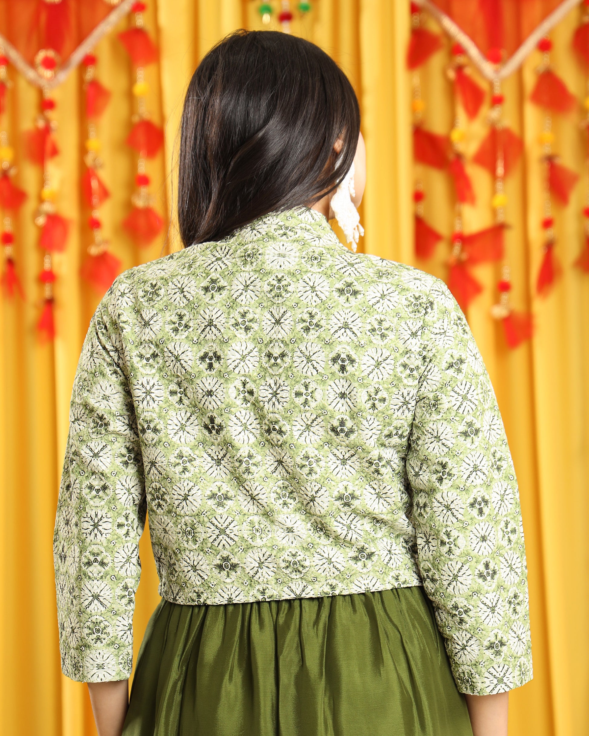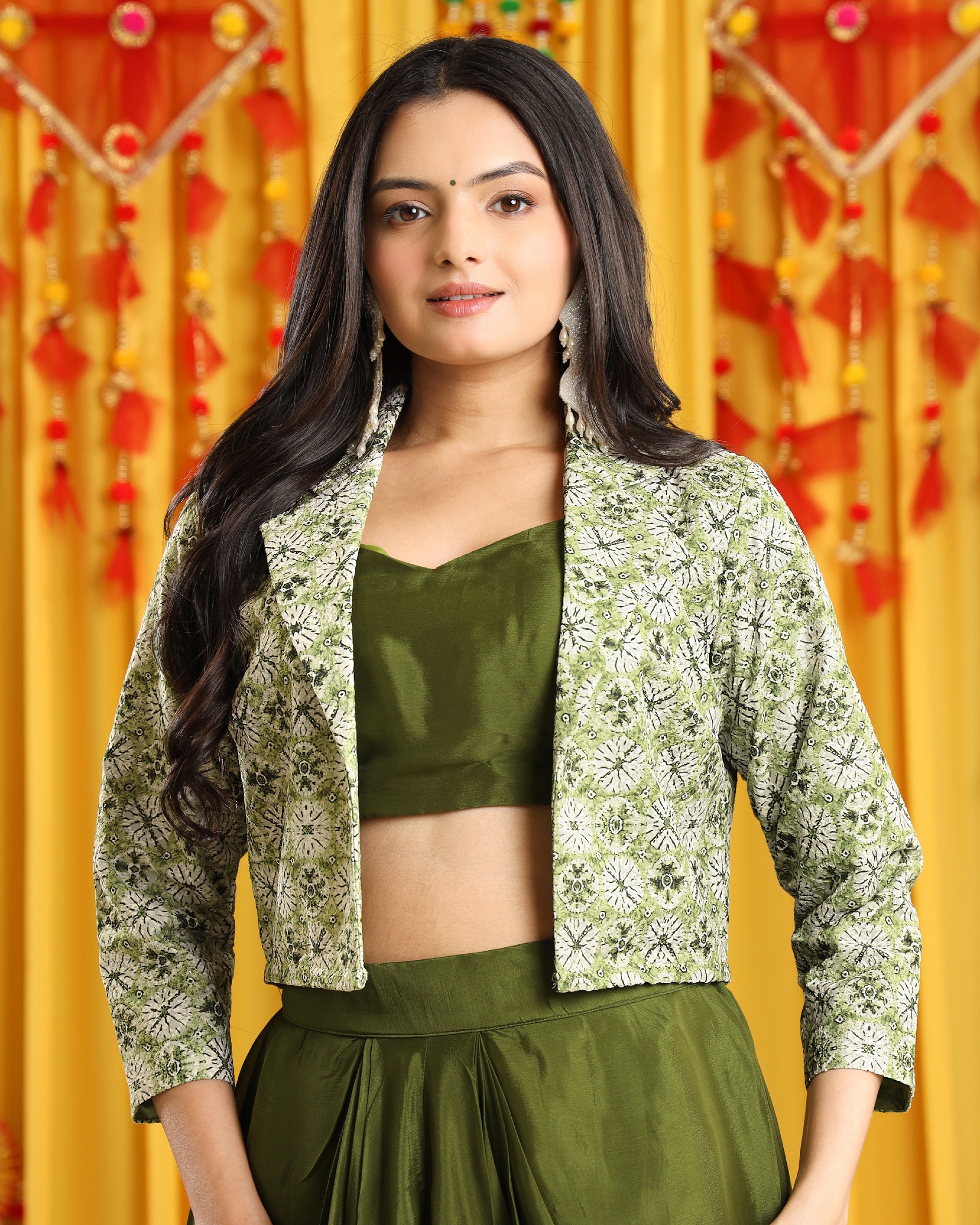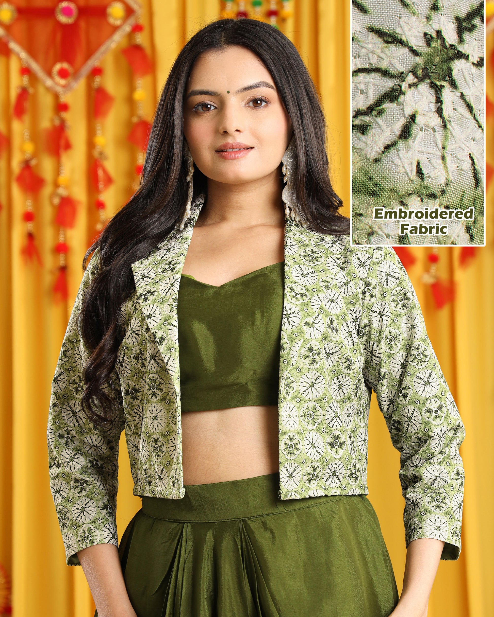 Mehndi jackets: A fusion of tradition and contemporary style, perfect for celebrating love and joy during wedding festivities. Crafted with intricate details and vibrant colors, these jackets add an extra layer of elegance to your Mehndi or Haldi ceremony attire. Elevate your look and make a statement with our exquisite Mehndi jackets.