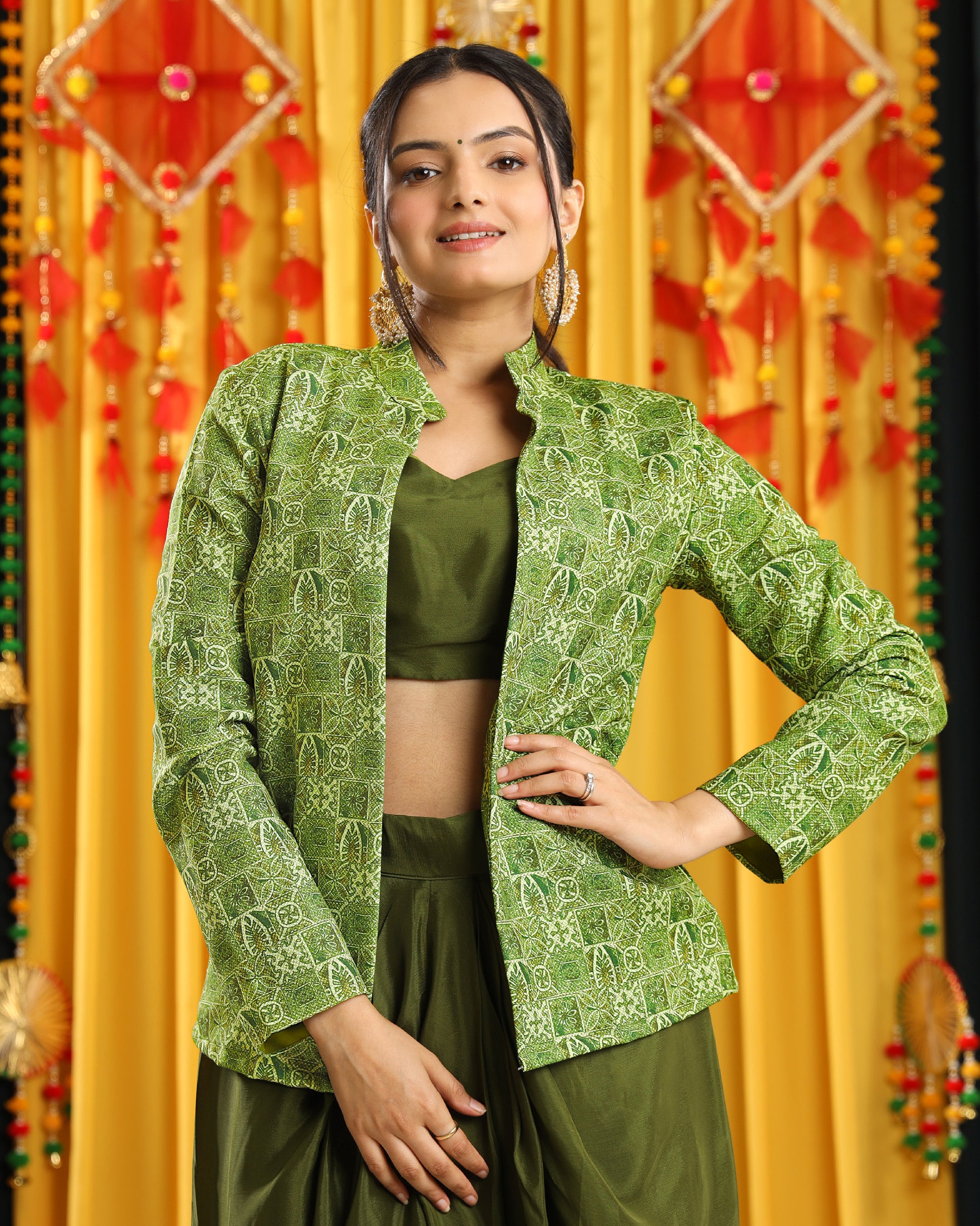 Mehndi jackets: A fusion of tradition and contemporary style, perfect for celebrating love and joy during wedding festivities. Crafted with intricate details and vibrant colors, these jackets add an extra layer of elegance to your Mehndi or Haldi ceremony attire. Elevate your look and make a statement with our exquisite Mehndi jackets.