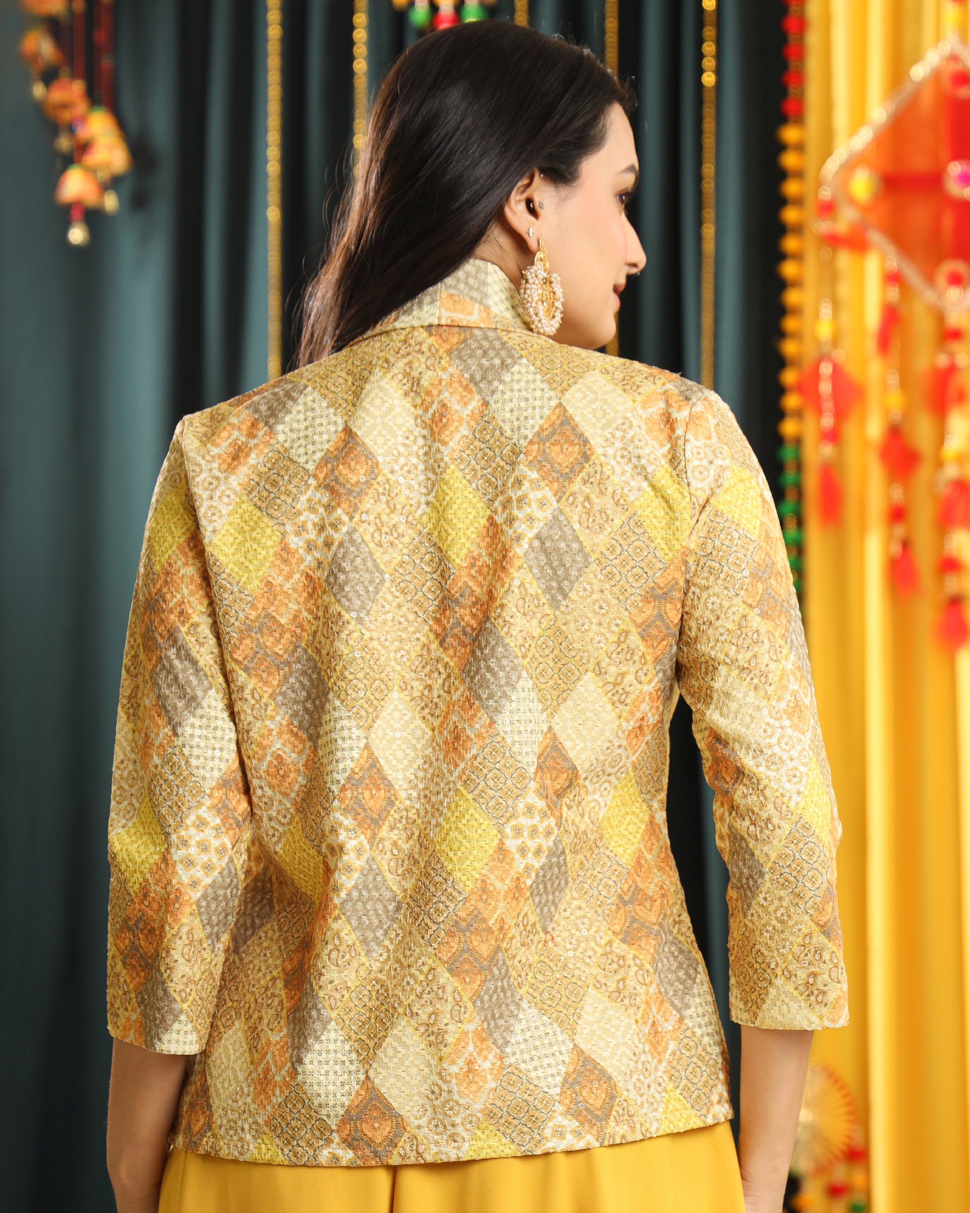 Haldi jackets can become an essential fashionable part of traditional Indian wedding attire. These jackets are often crafted from vibrant fabrics and adorned with intricate patterns. They are designed to be worn over traditional Indian outfits like kurta-pajamas, lehenga or more during pre-wedding ceremonies such as Haldi or Mehndi. Whether you're a bride, family member, or guest, these Haldi jackets are a stylish choice to enhance your look and celebrate a joyous occasion.