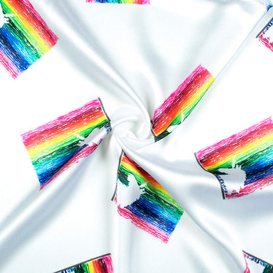 -10% offWhite And Multi-Color Peacock Feather Pattern Digital Print Japan Satin Fabric White And Multi-Color Peacock Feather Pattern Digital Print Japan Satin Fabric